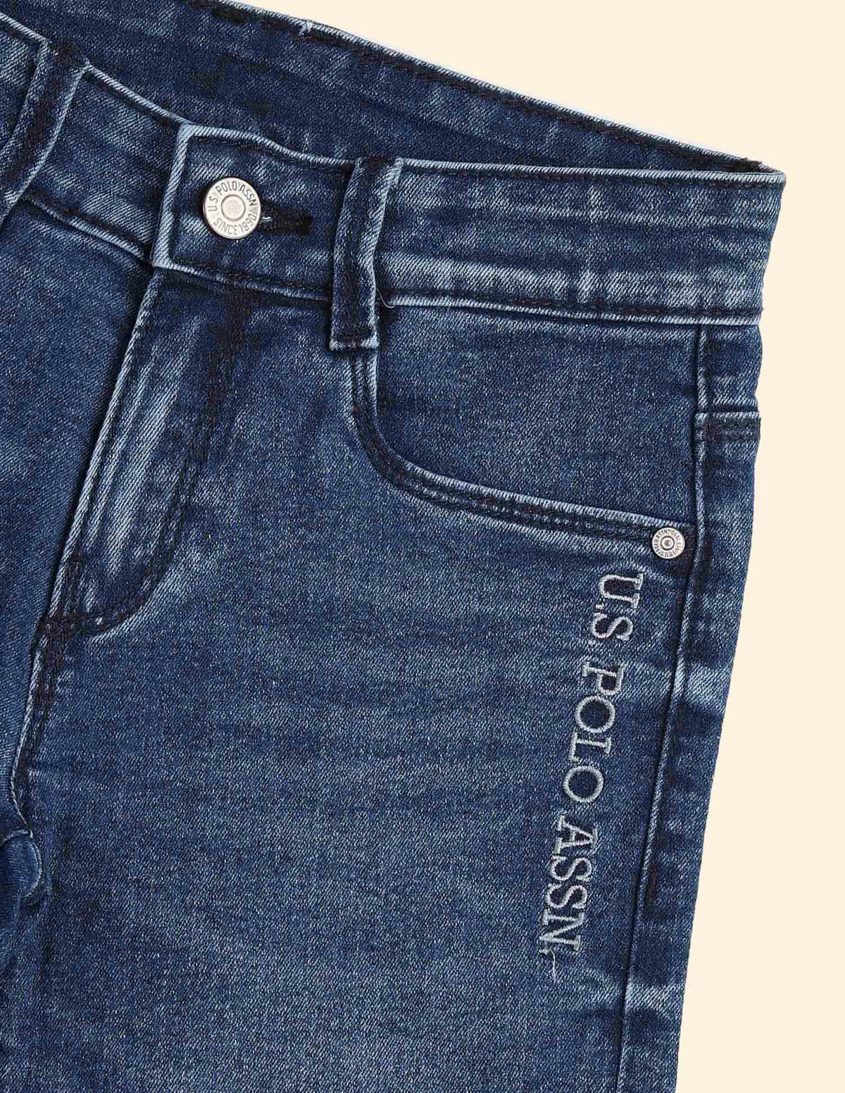 Story: Boys' jeans with panel embroidery branding, adding a stylish touch to casual outfits for young trendsetters.