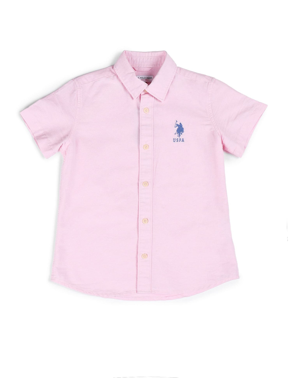| Spread collar | Logo at chest | Full button placket | Short sleeves | Curved hemline | Solid pattern | Twill weave | Regular fit |