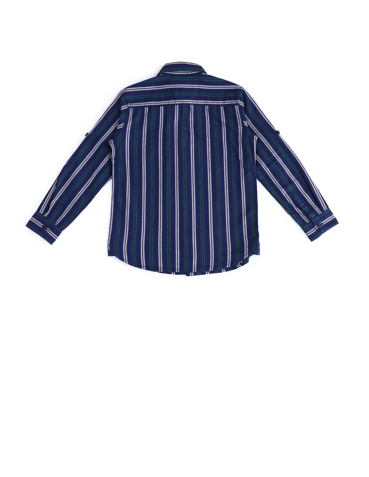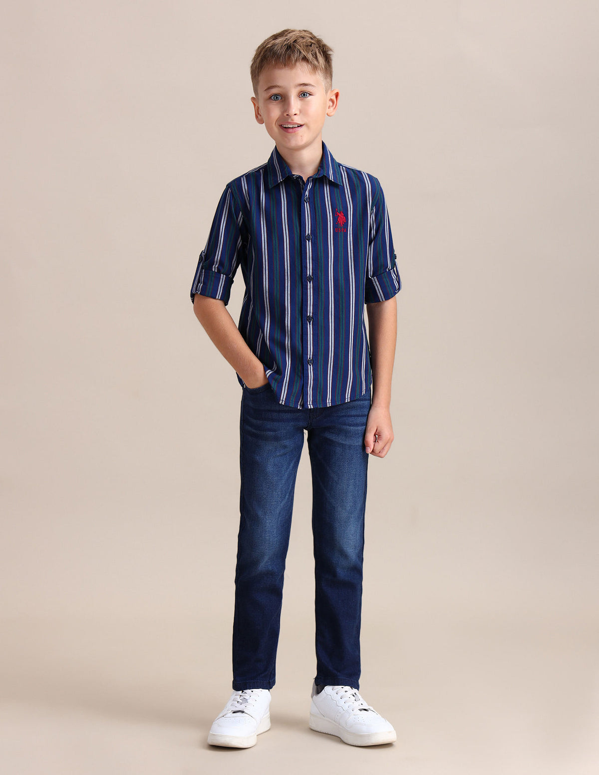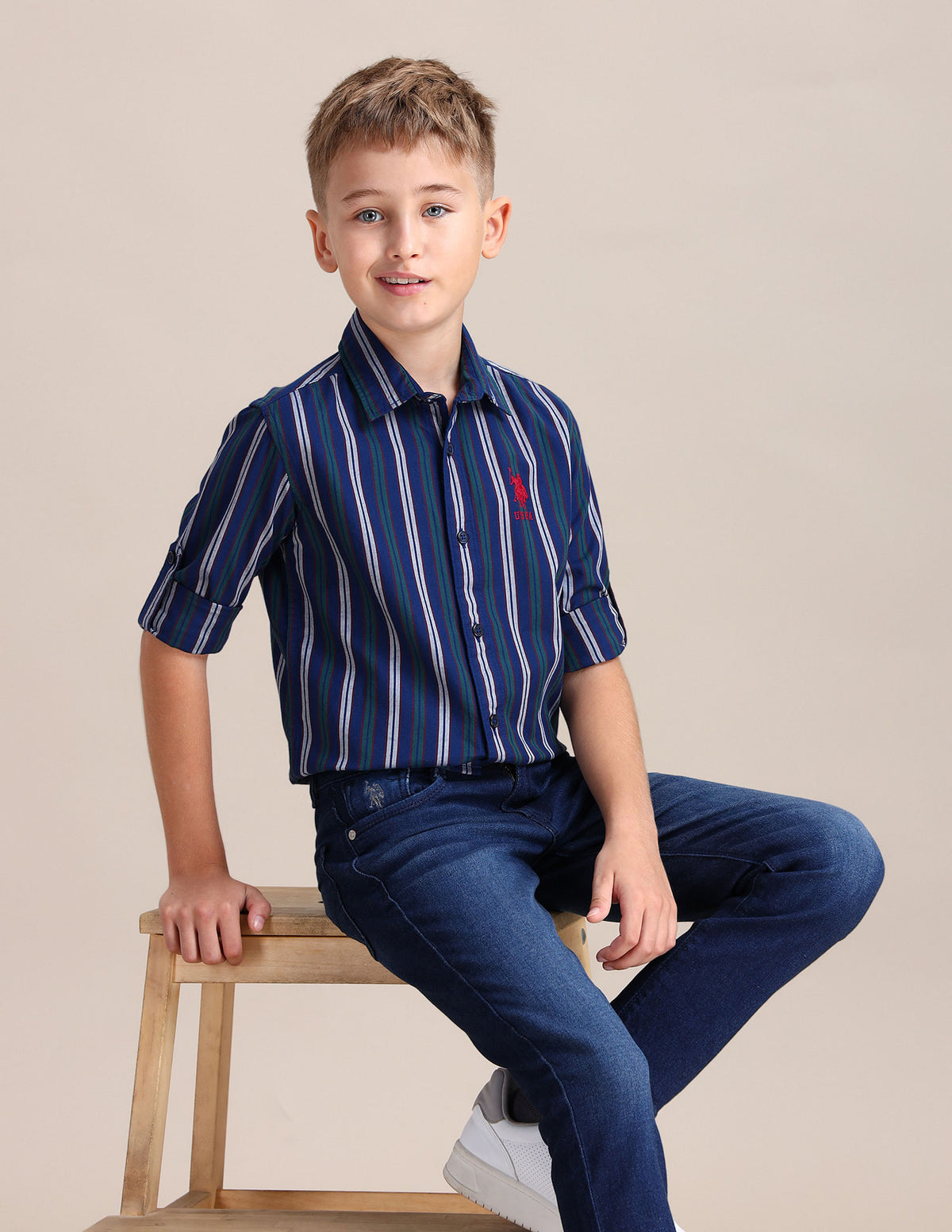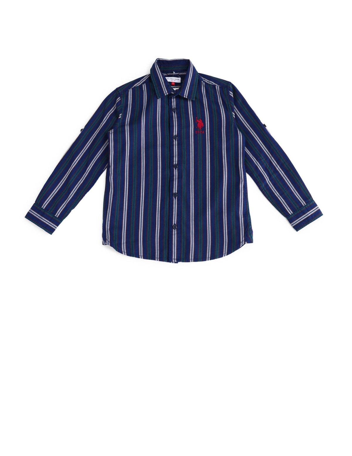 | Spread collar | Embroidered logo at chest | Full button placket | Long sleeves with rounded cuffs | Curved hemline | Vertical striped pattern | Twill weave | Regular fit |