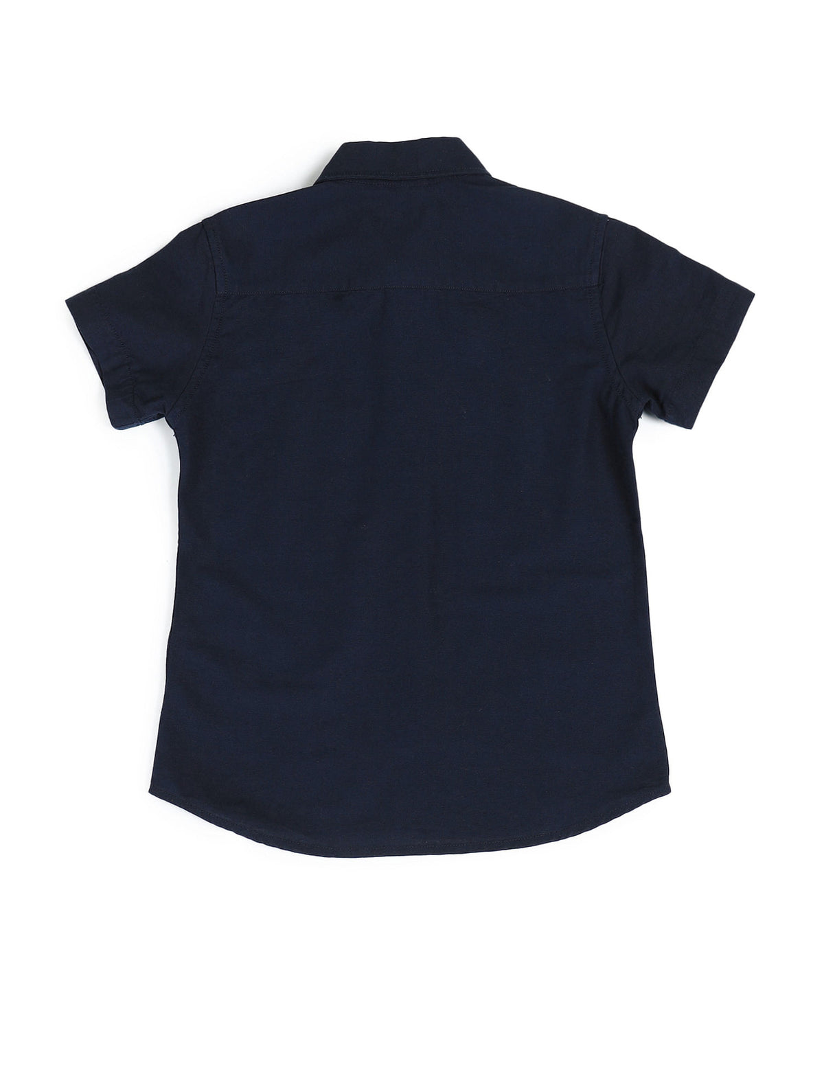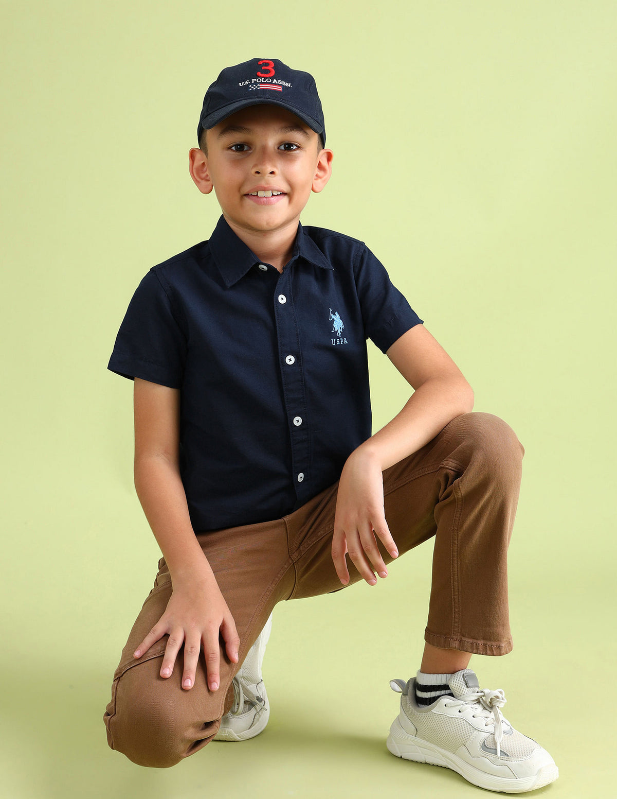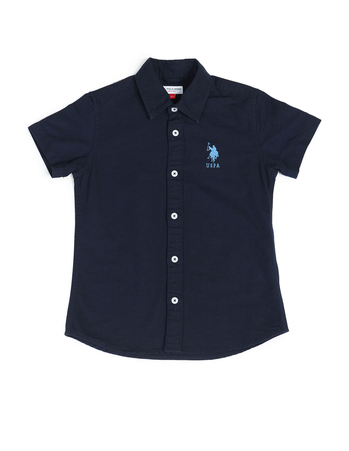 | Spread collar | Logo at chest | Full button placket | Long sleeves with rounded cuffs | Curved hemline | Solid pattern | Dobby weave | Regular fit |