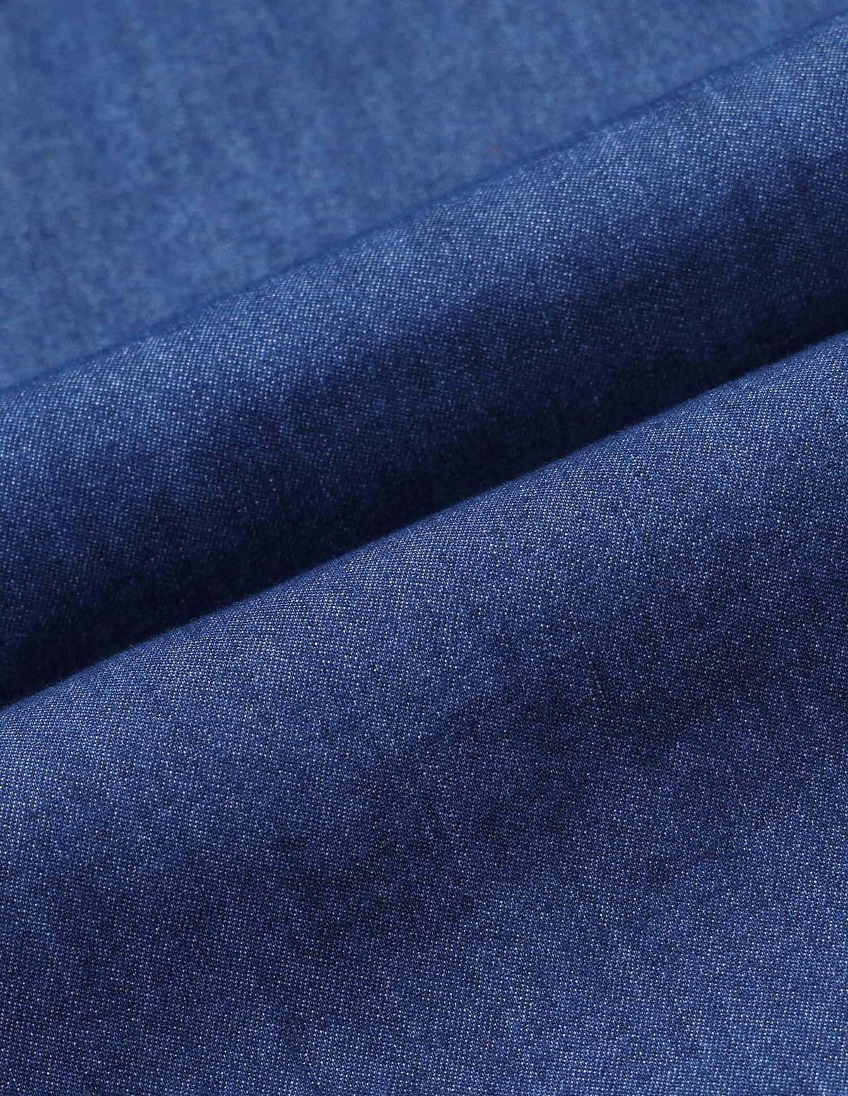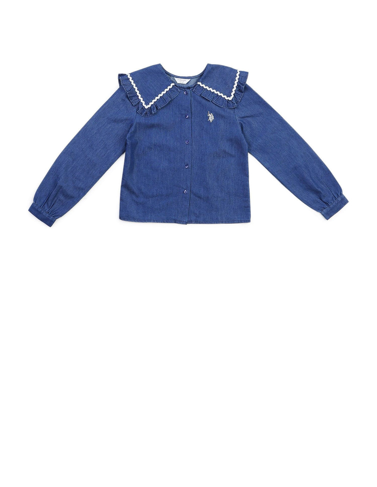 | Round neck with cape collar finished with frilled hem | Full button closure | Long sleeves with buttoned cuffs | Straight hemline | Washed pattern | Chambray weave | Regular fit |