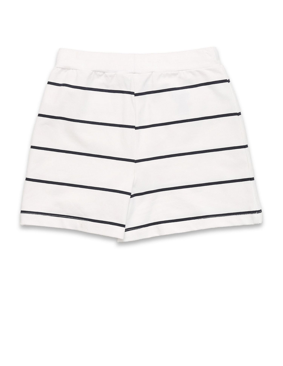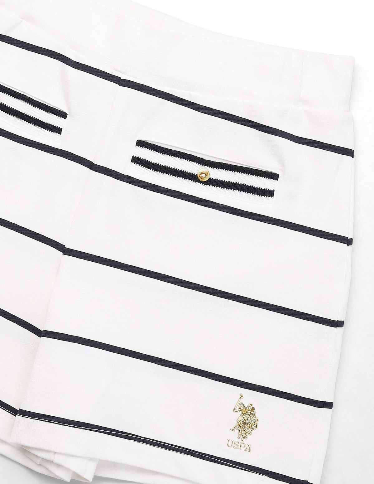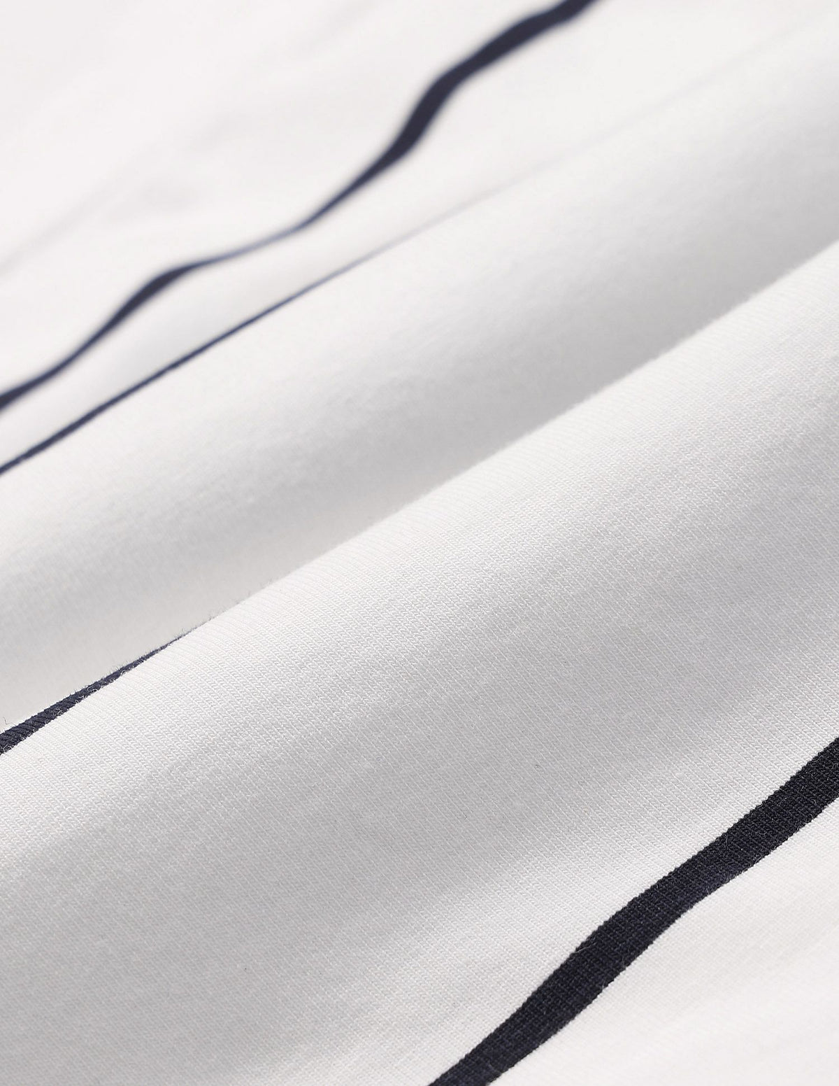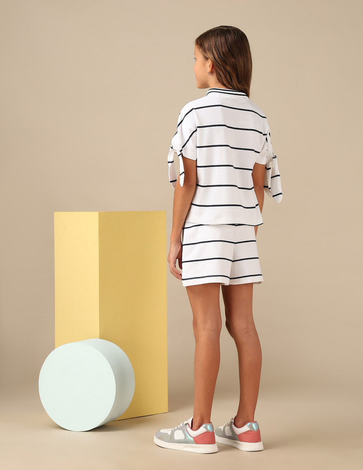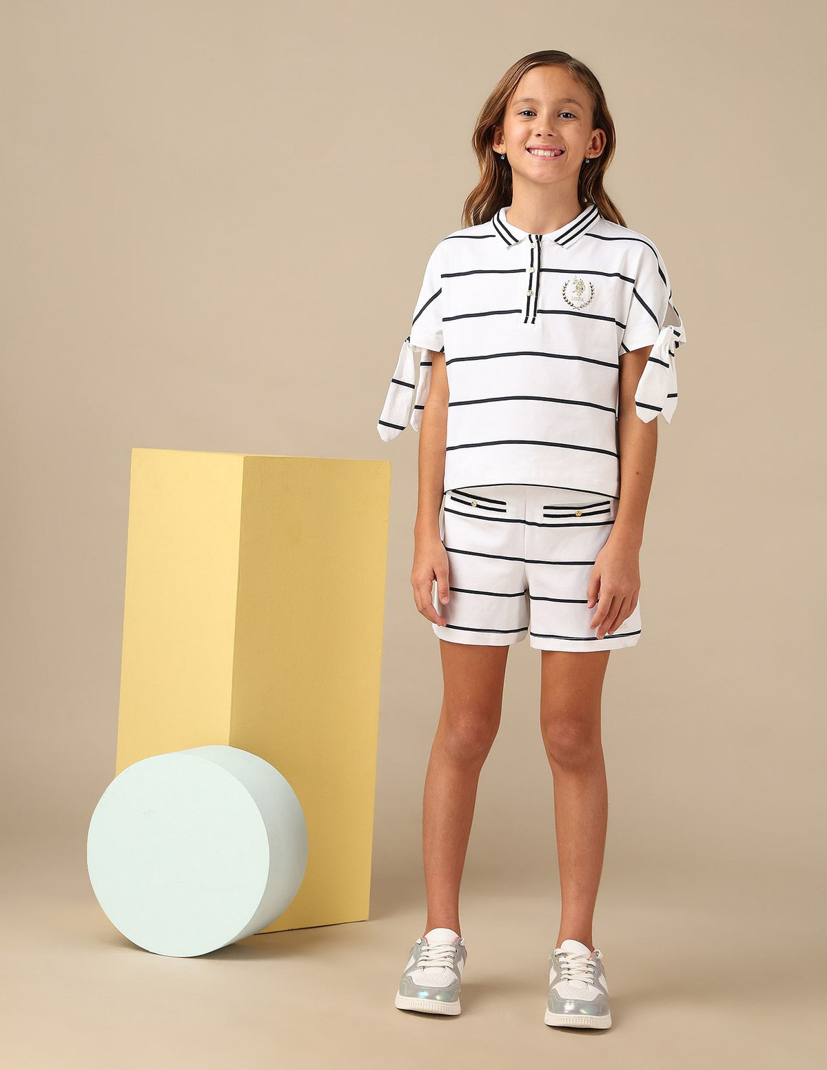 | Polo collar | Logo at chest | Short button placket | Short sleeves with tie-up hems | Straight hem | Horizontal striped pattern | Knitted | Regular fit |