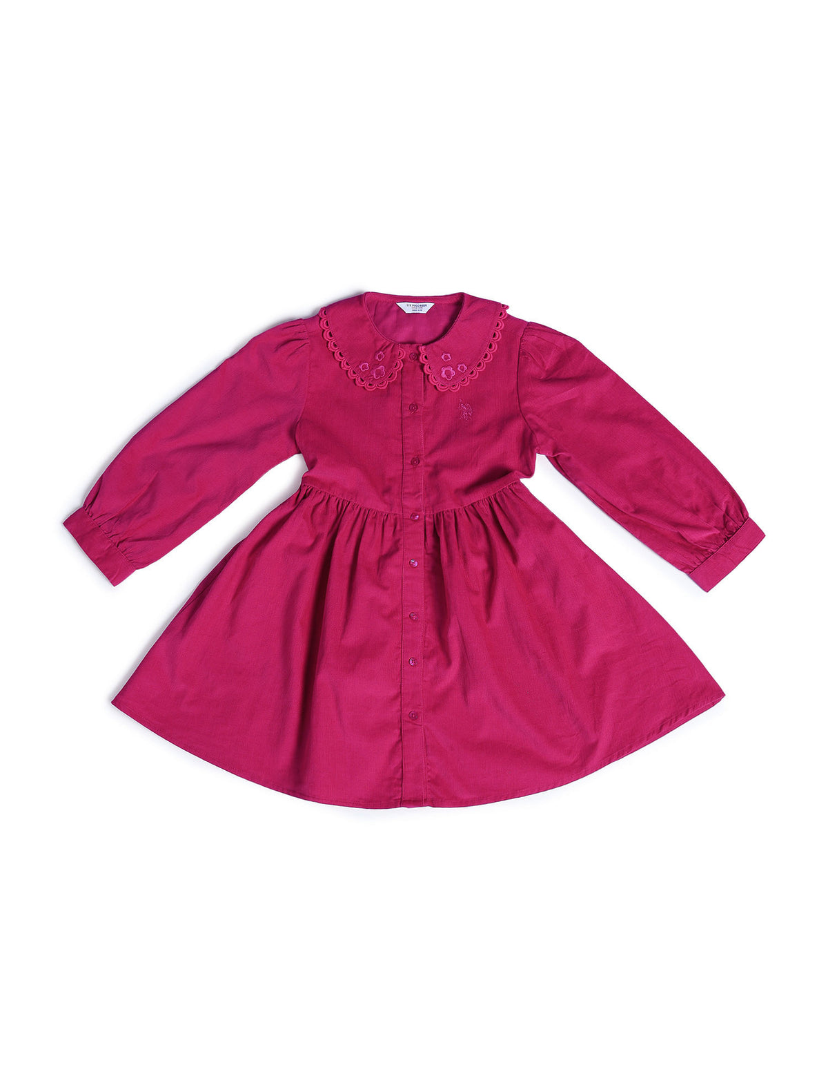 | Peterpan collar | Logo at chest | Full button placket | Long sleeves | Gathered waist | Flared hem | Solid pattern | Woven | Regular fit |
