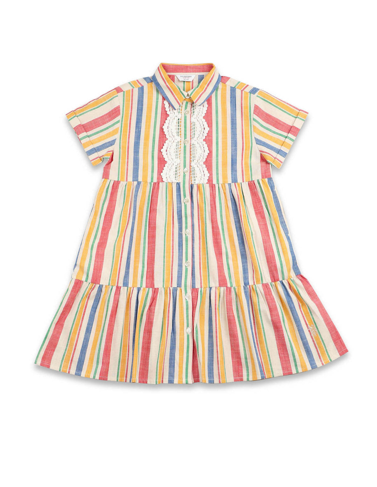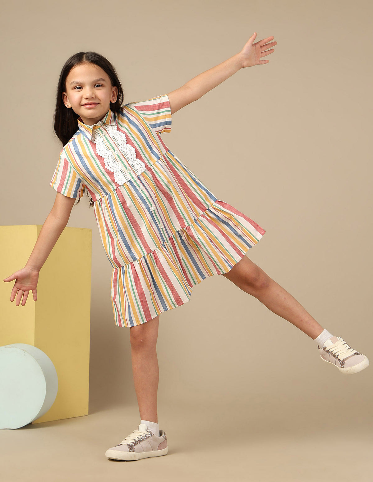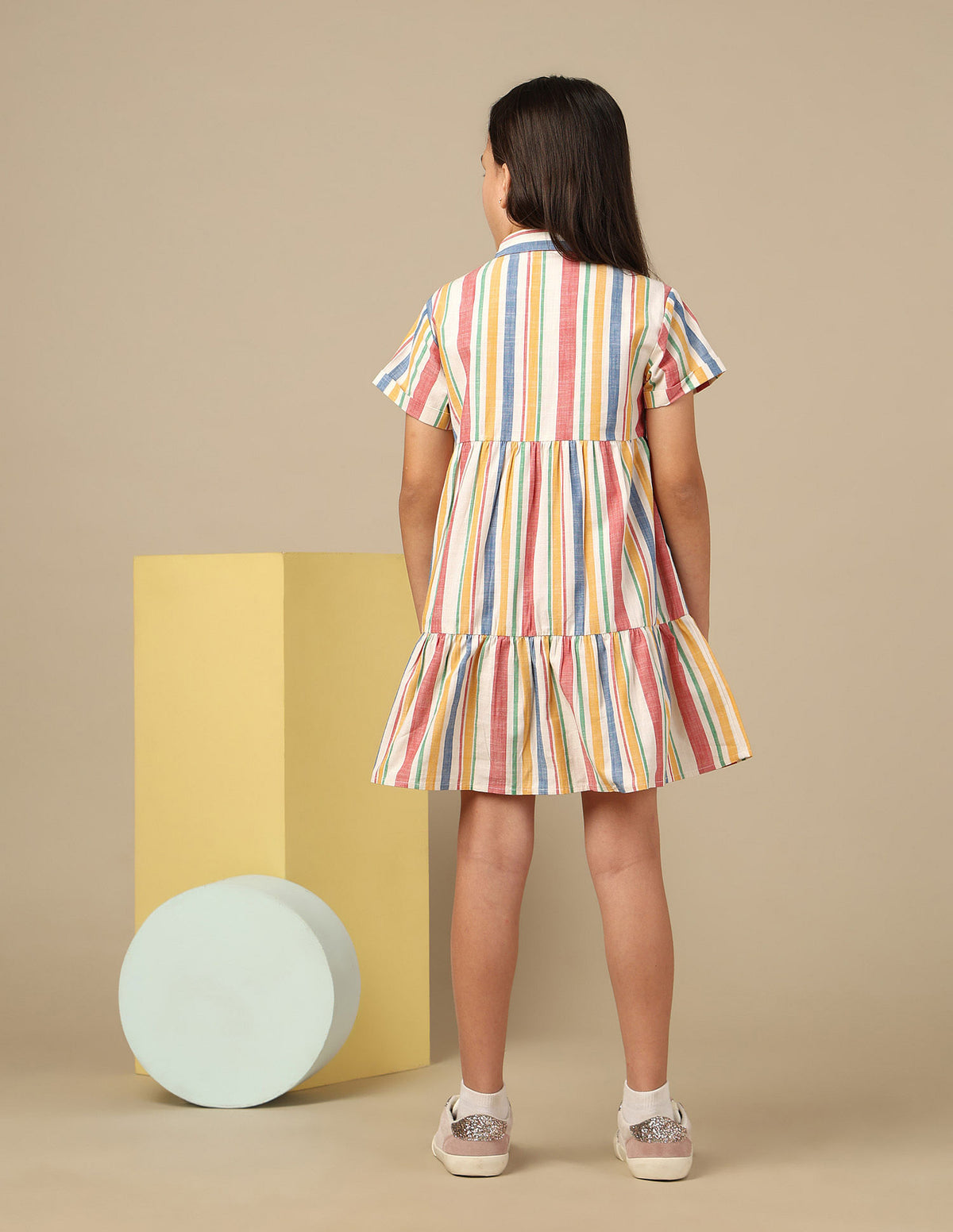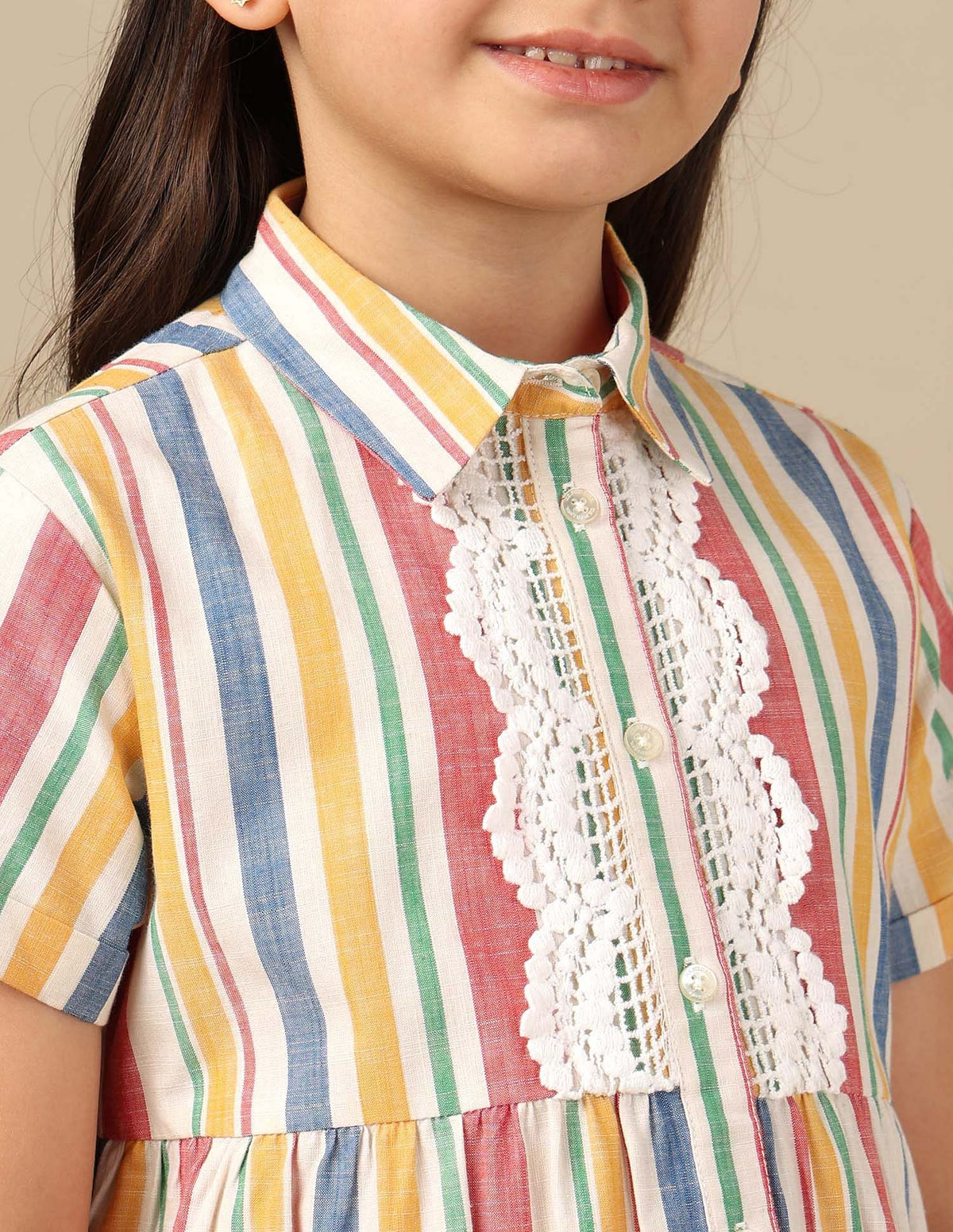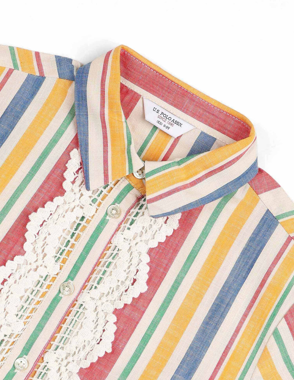 | Shirt collar | Half placket button closure | Short sleeves | Vertical striped pattern | Regular fit |