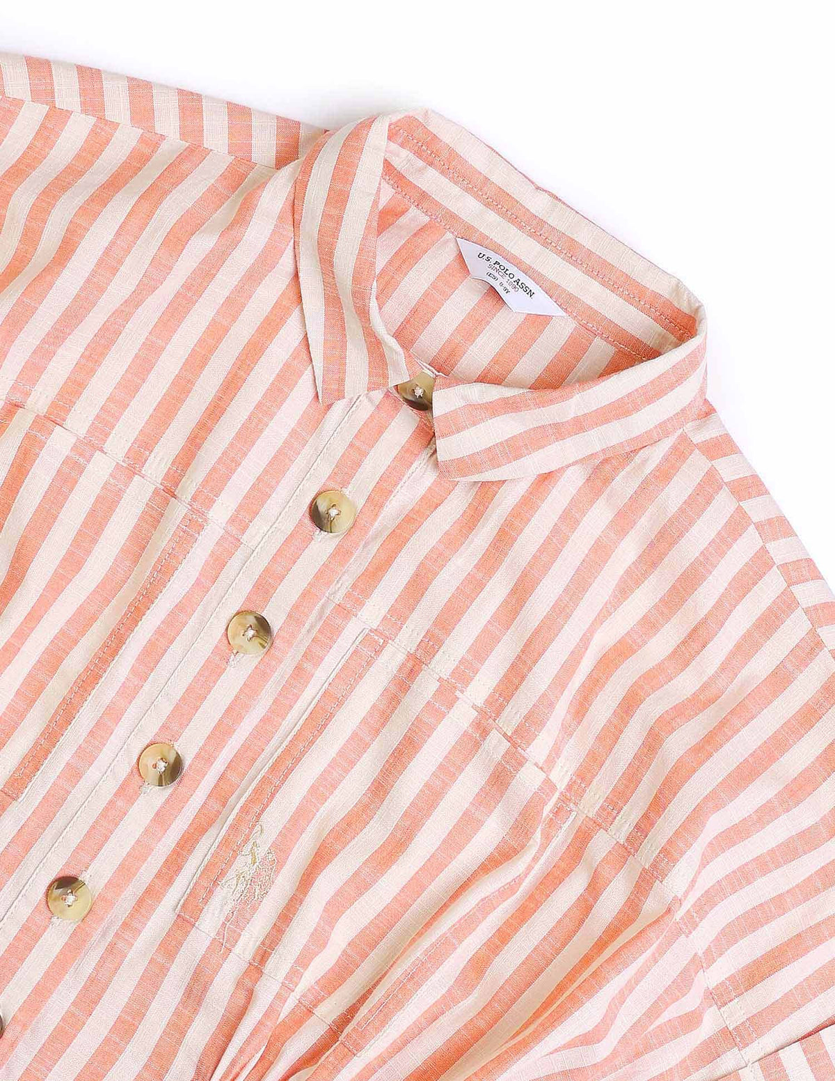 | Shirt collar | Button closure | Short sleeves | Vertical striped pattern | Regular fit |