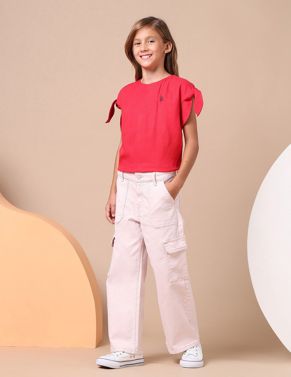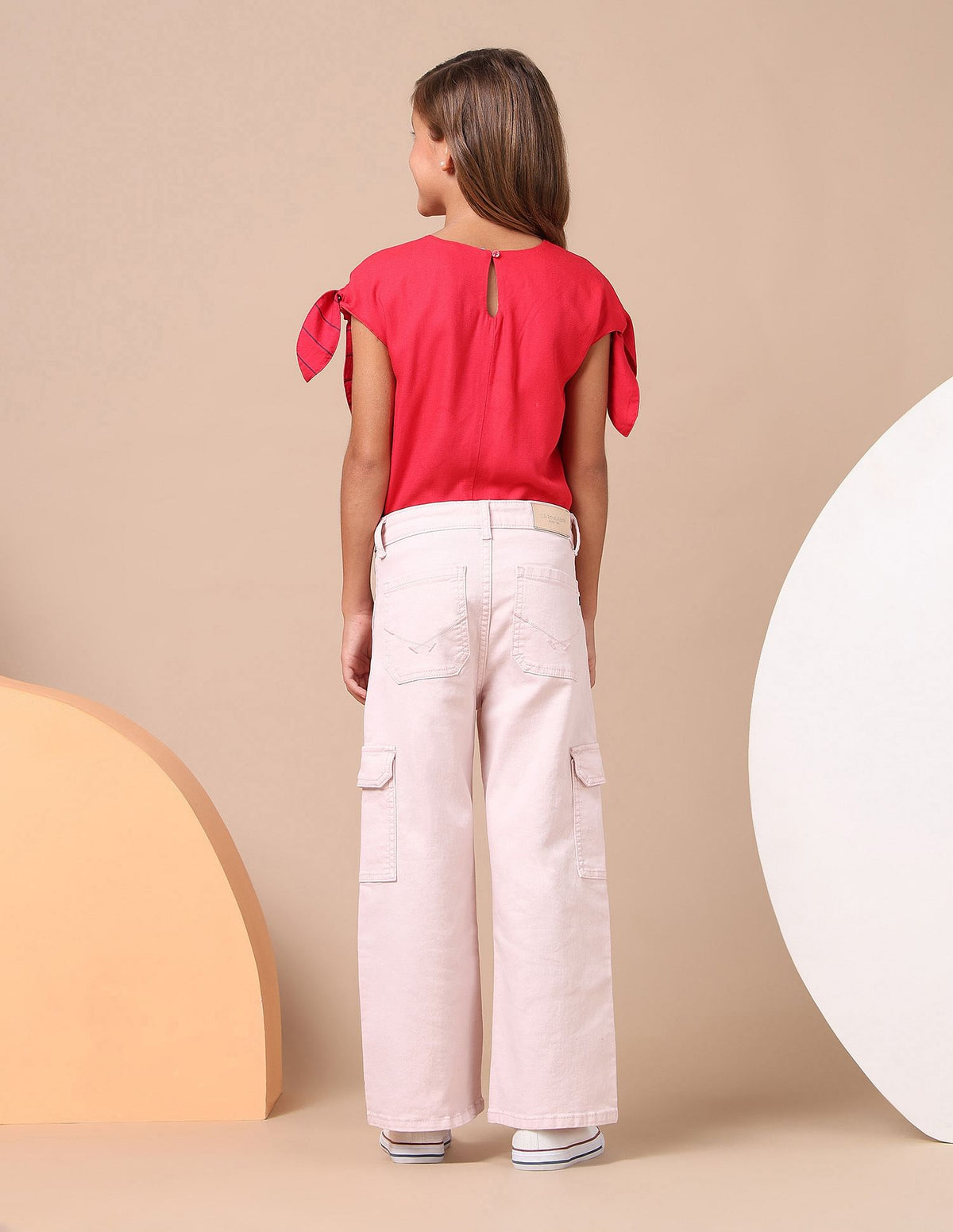 | Mid-rise waist | Button and zip fly closure | Five pockets | Wide leg fit |