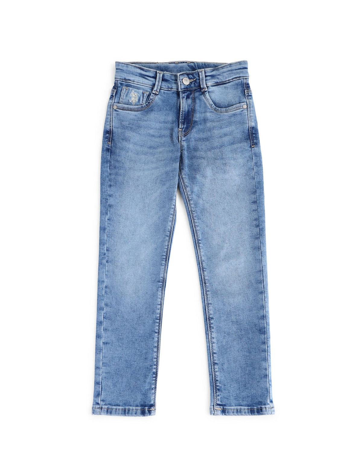 | Mid-rise waist | Button closure with zip fly | Five pocket styling | Stonewashed | Denim weave | Slim fit |