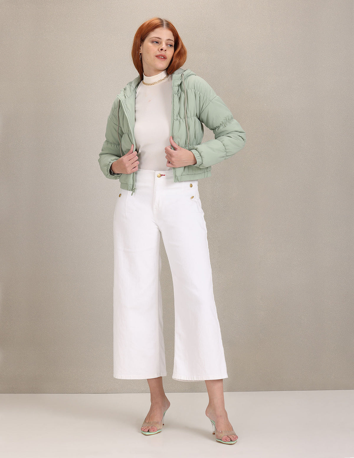 Light Green Gathered Solid Hood Puffer Jacket