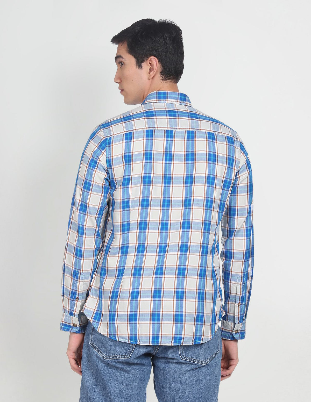 Men Beige And Blue Twill Weave Plaid Check Casual Shirt