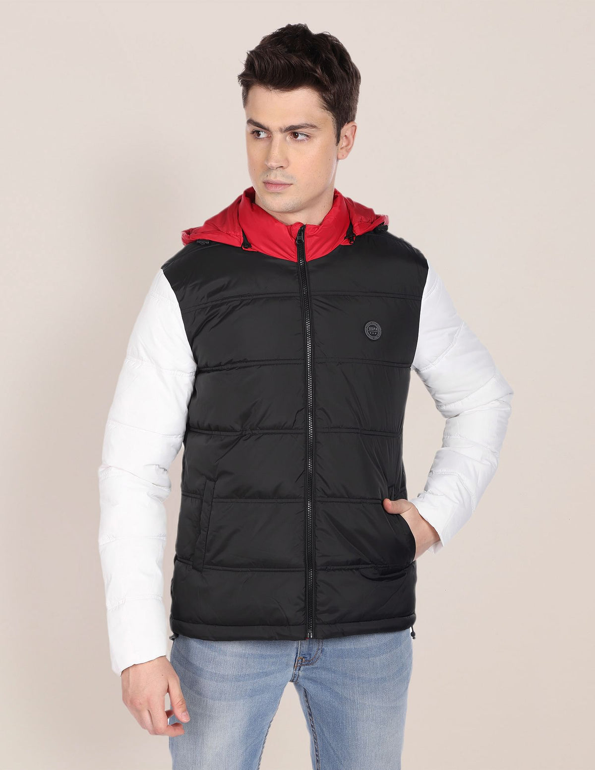 Men Black And White High Neck Colour Block Puffer Jacket
