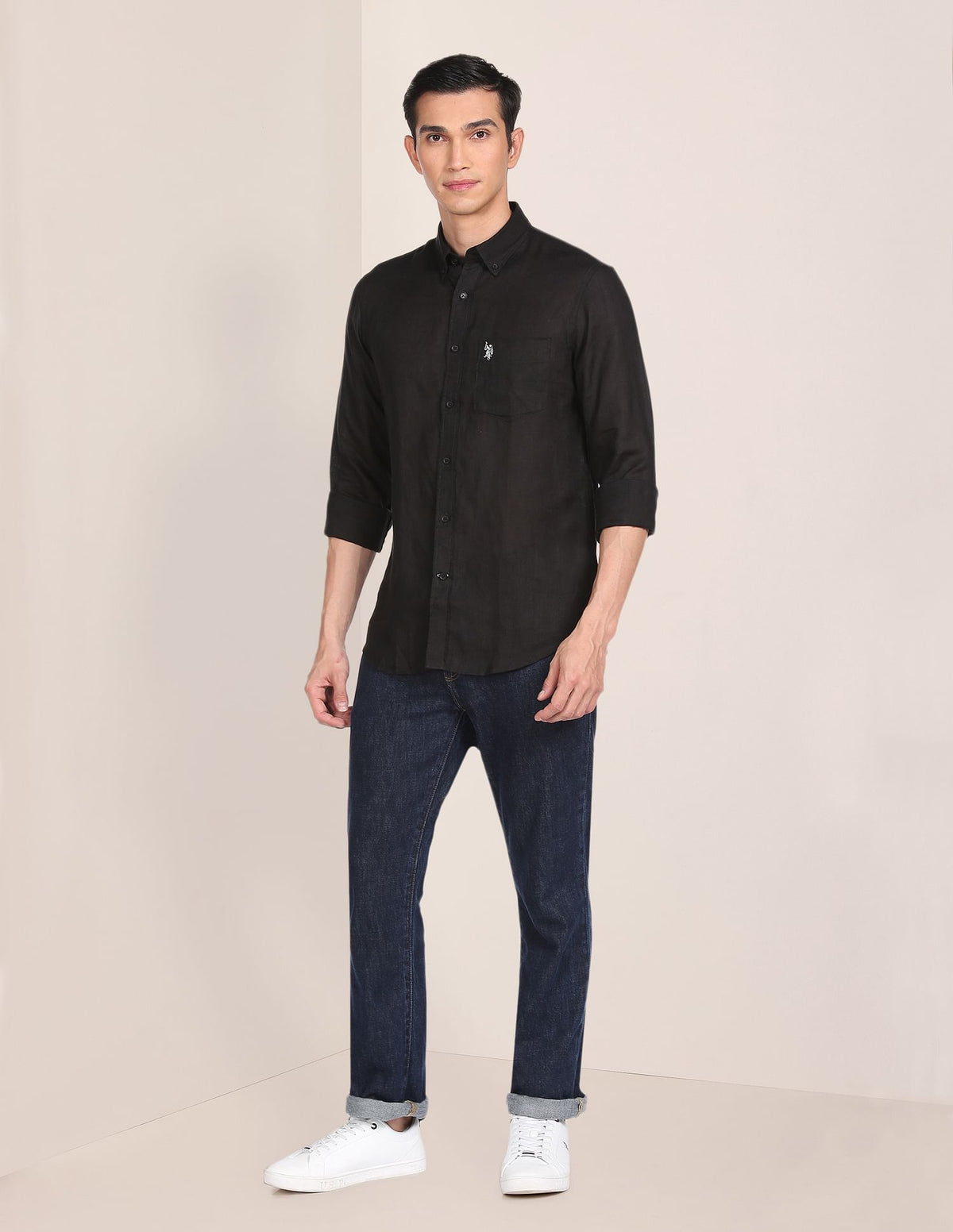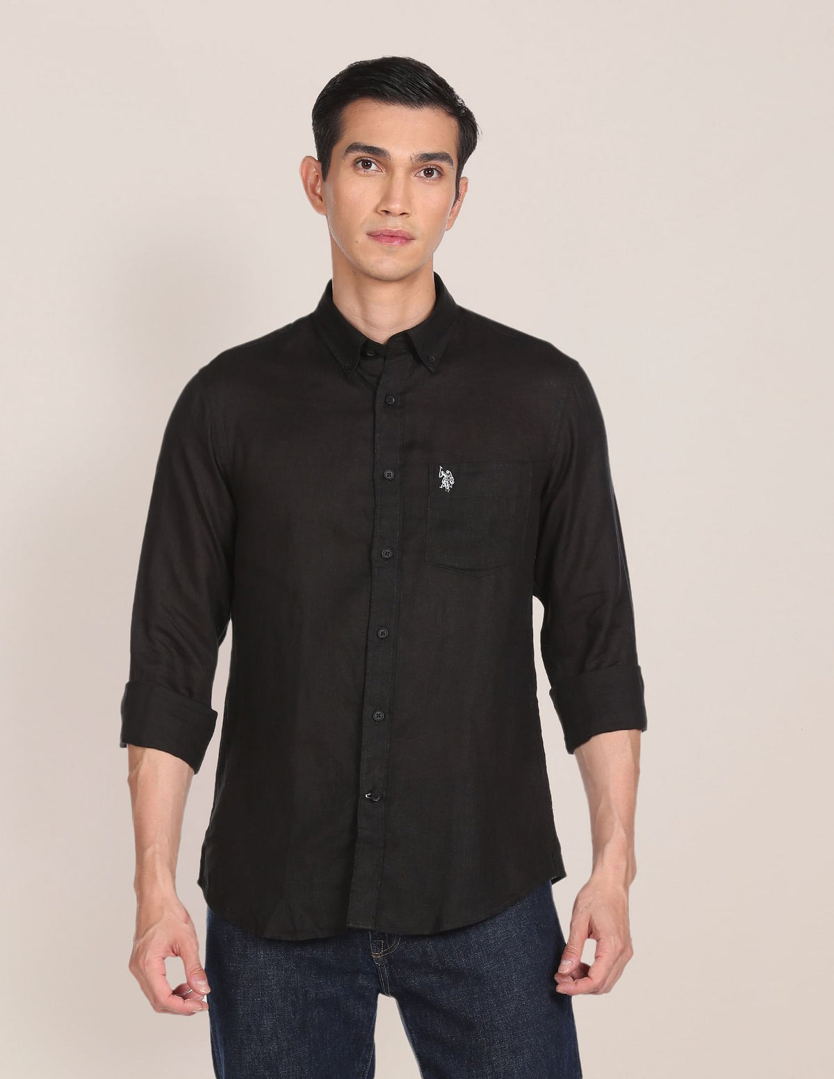Story: Experience fine tailoring in this U.S. Polo Assn shirt. This solid number is crafted from premium linen fabric, allowing a relaxed feel. The super-fine stitching ensures you look sharp wherever you go. It's framed with a carefully spread collar, full button placket and long sleeves. Team it with dark trousers and polished oxfords.