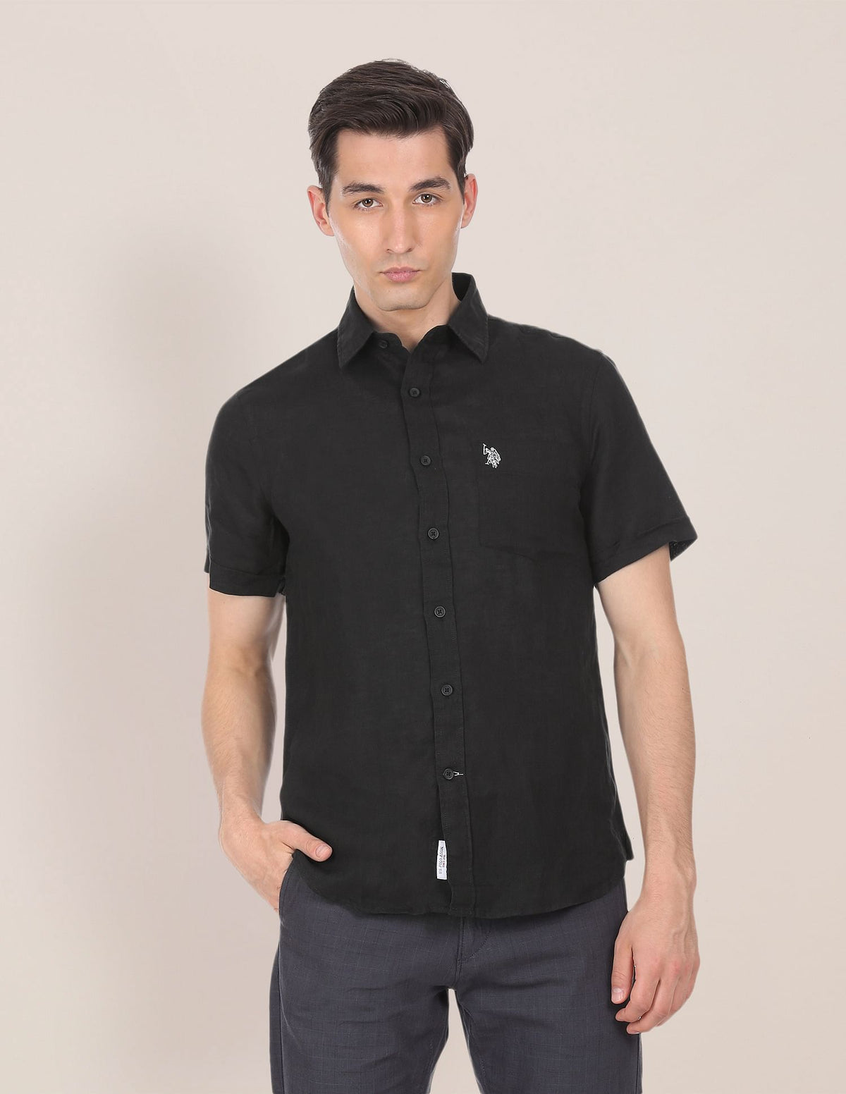 Men Black Short Sleeve Linen Solid Casual Shirt