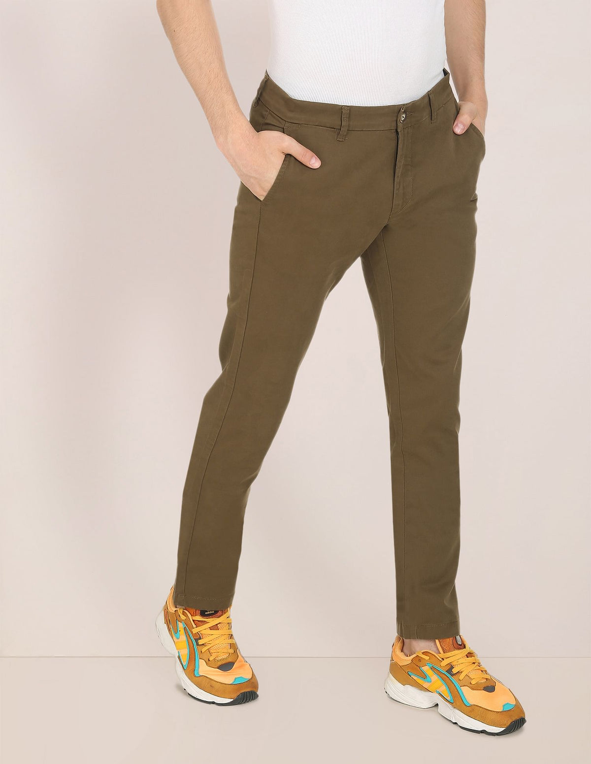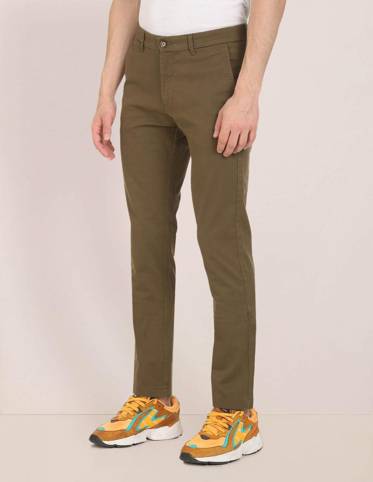 Men Dark Khaki Denver Slim Fit Solid Casual Trousers