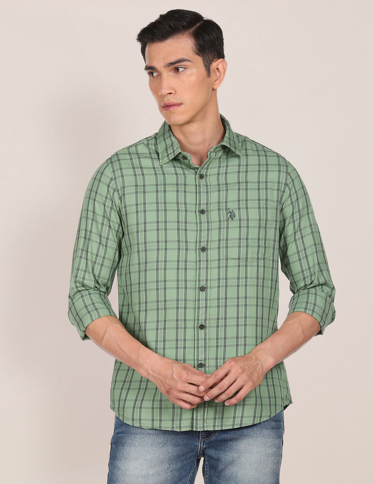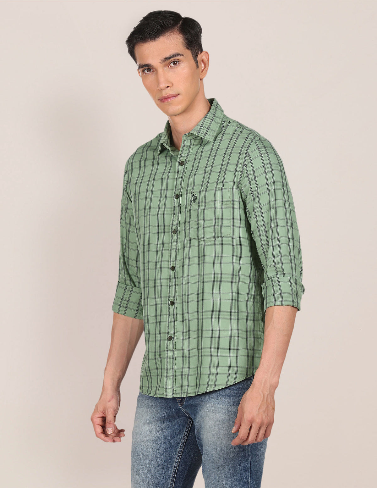 Men Green Pure Cotton Check Casual Shirt