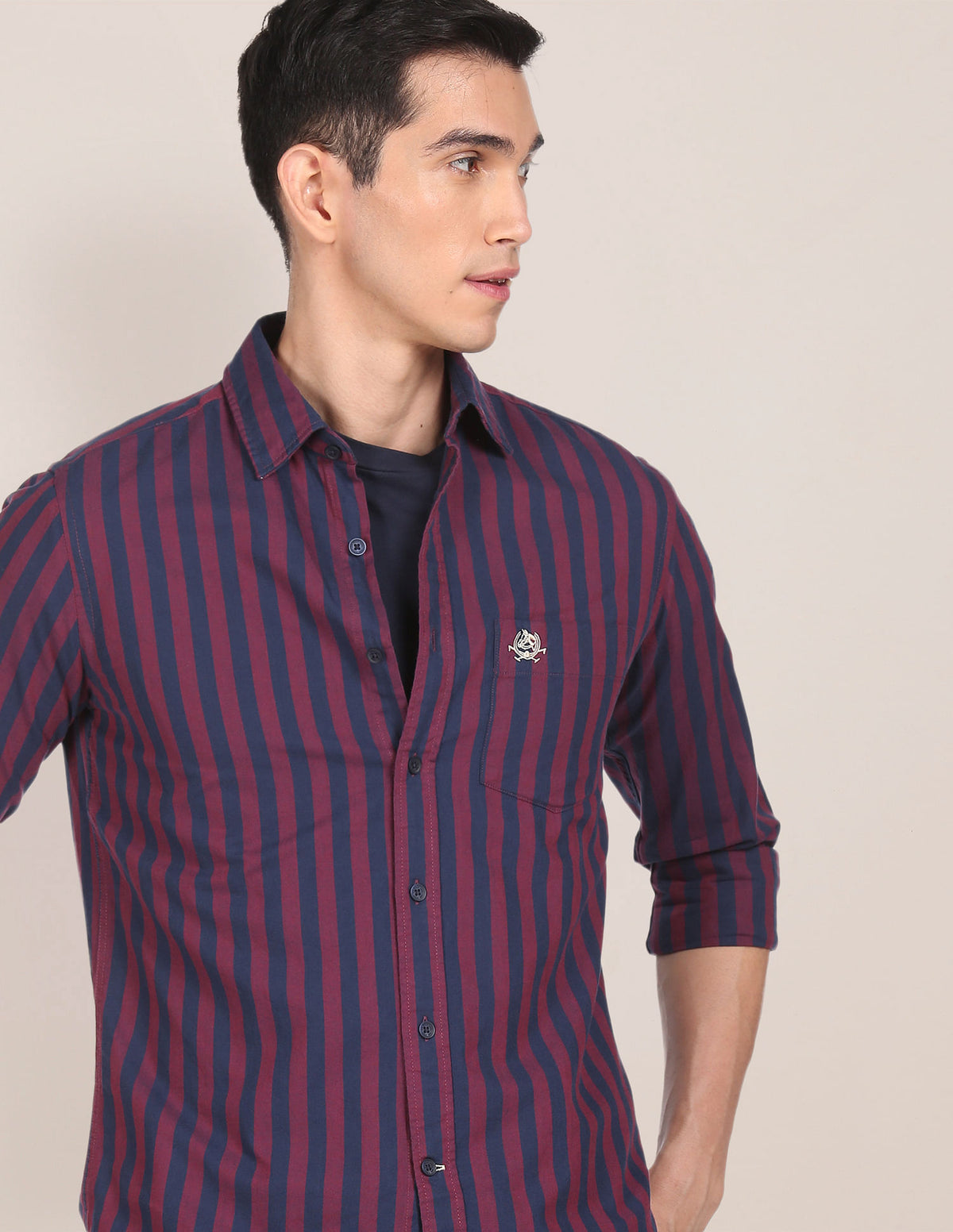Men Maroon And Navy Striped Cotton Formal Shirt