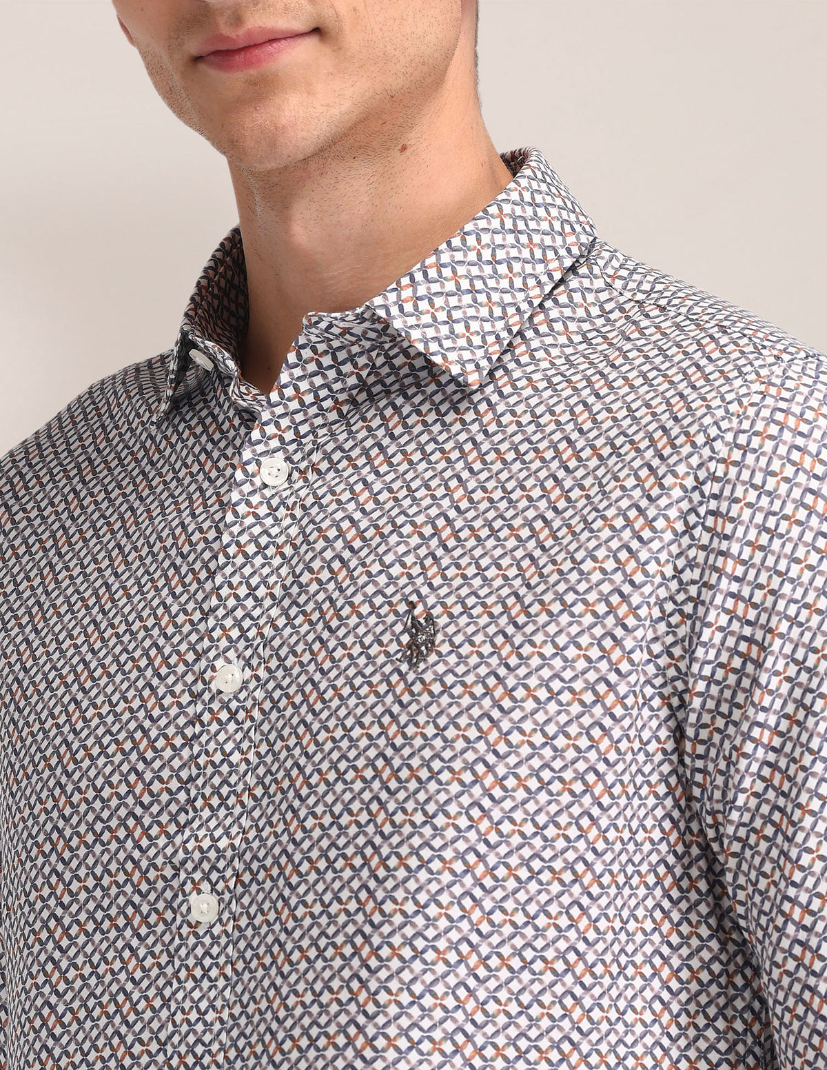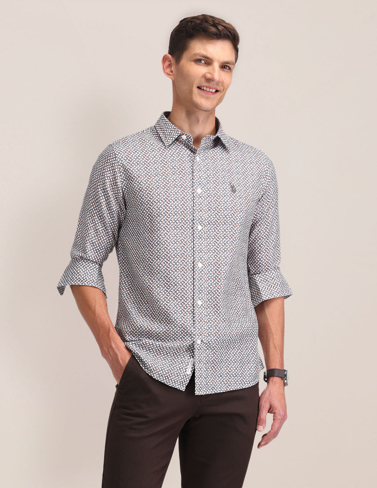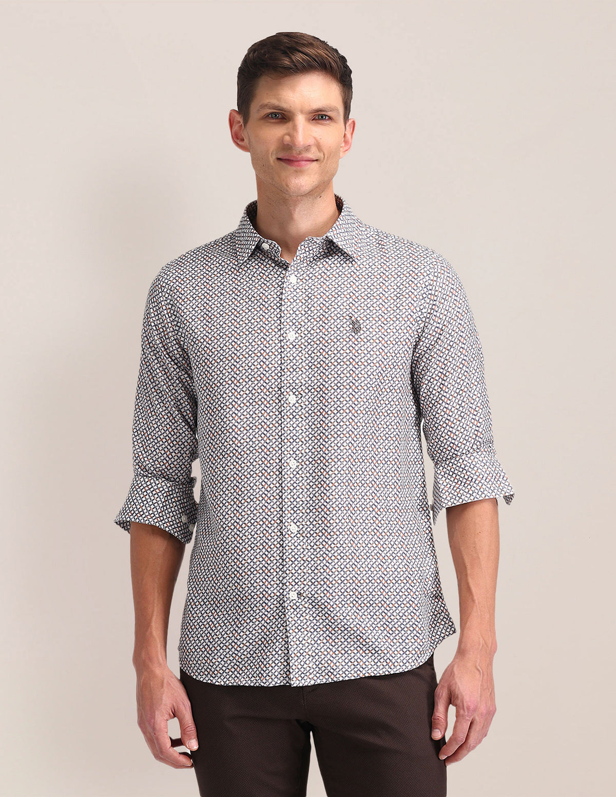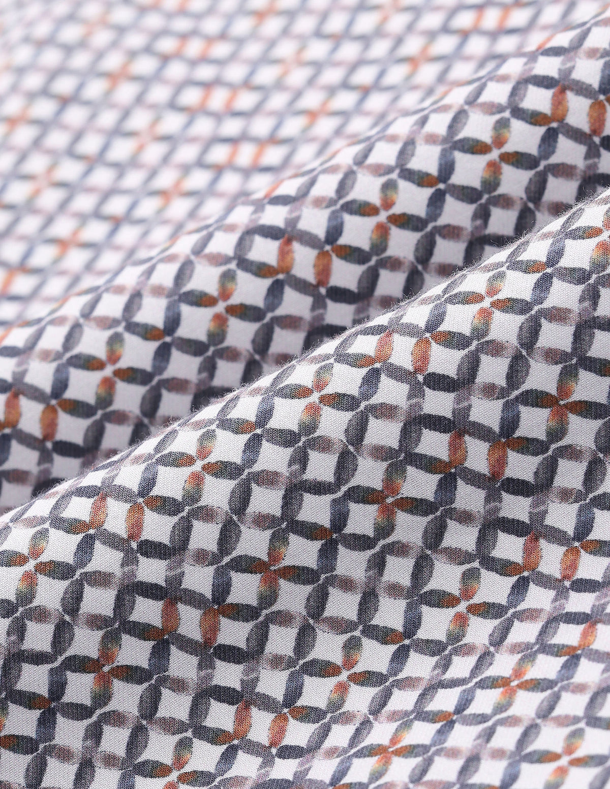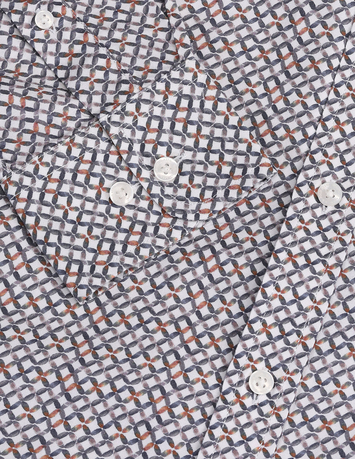 | Semi-cutaway collar | Logo at chest | Full button placket | Long sleeves with rounded cuffs | Curved hemline | All-over digital printed pattern | Satin weave | Brand fit: Tailored fit | Fit mapping: Regular fit