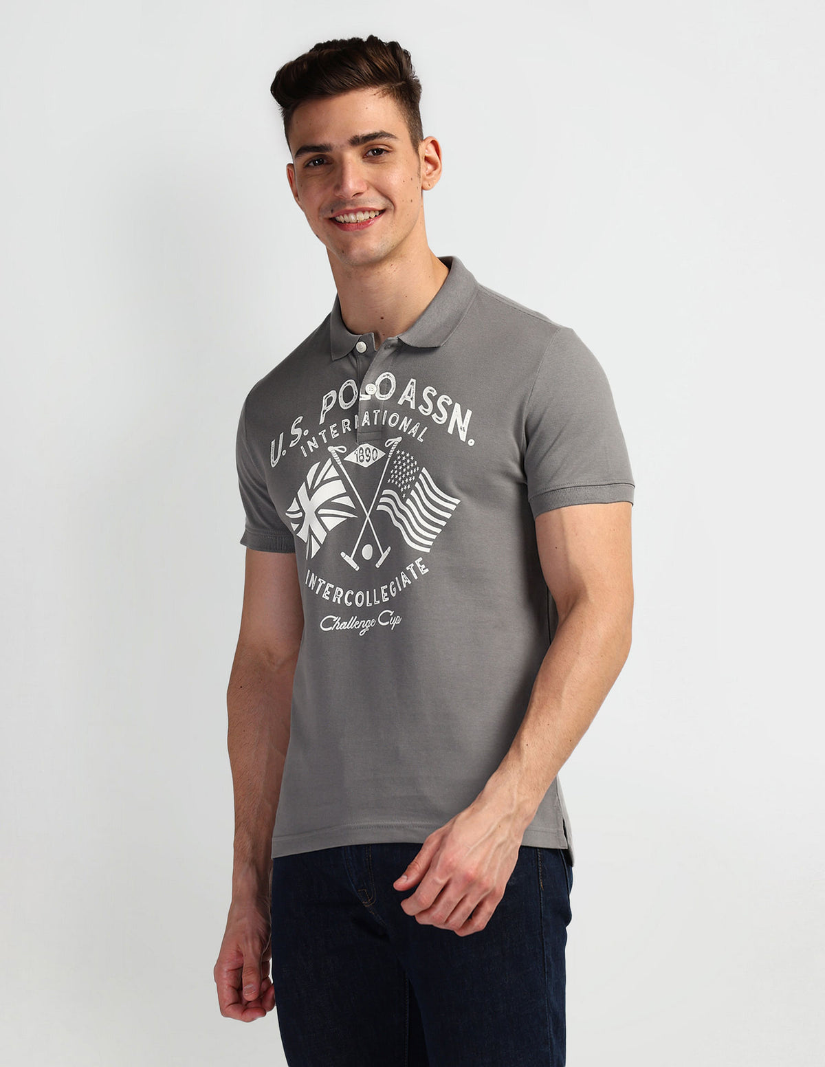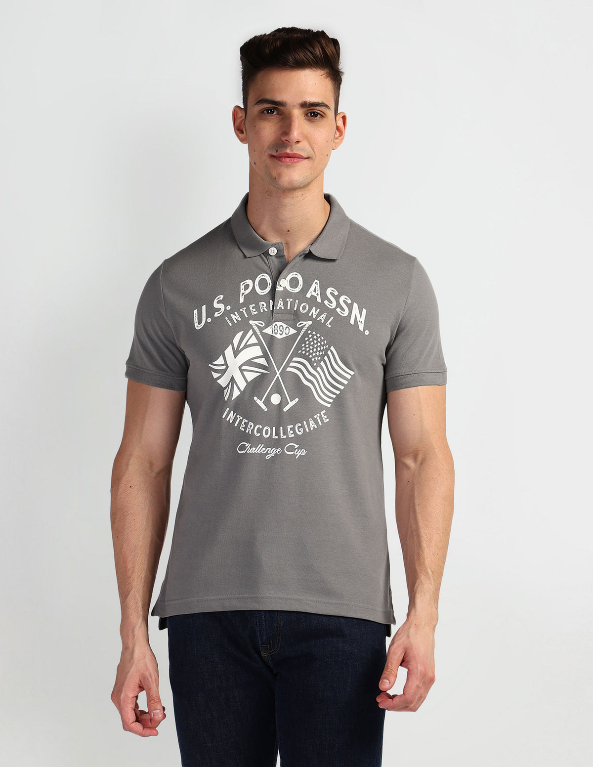 | Polo collar | Short button placket | Short sleeves | Ribbed collar and sleeve hems | Uneven vented hem | Brand printed pattern | Pique knit | Muscle fit