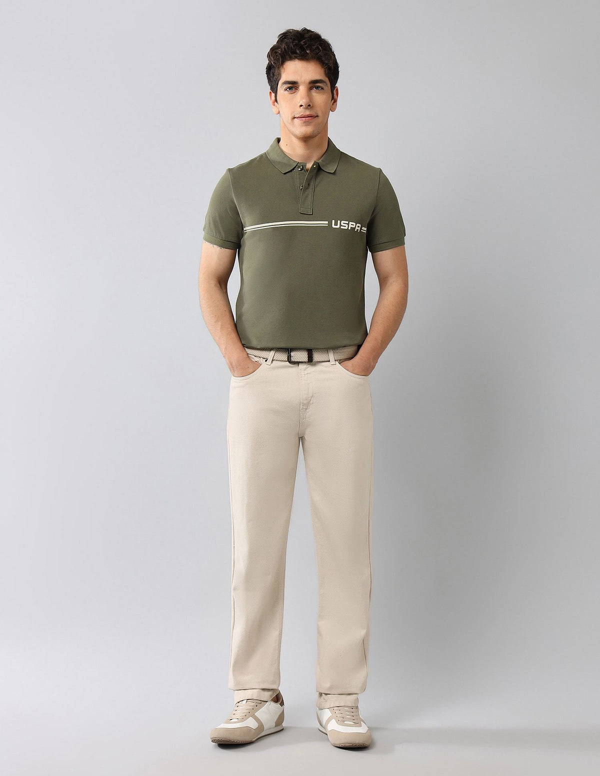 | Polo collar | Logo at chest | Short button placket | Short sleeves | Ribbed collar and sleeve hems | Uneven vented hem | Solid pattern | Pique knit | Muscle fit |