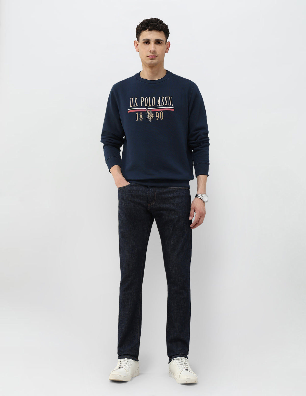 Story: Comfort meets style in this logo-adorned men's sweatshirt with round neck, available in 3XL for casual wear.