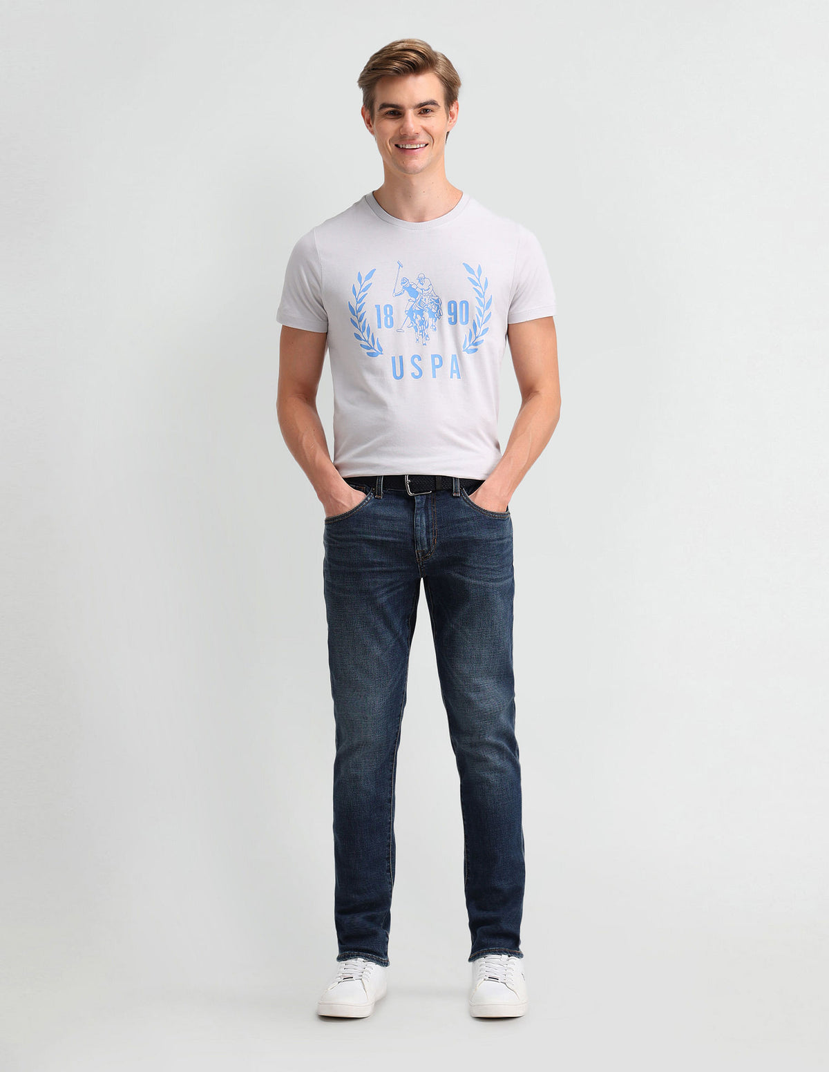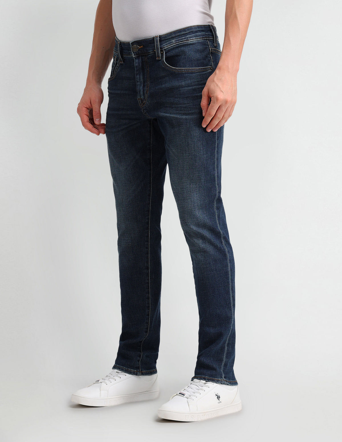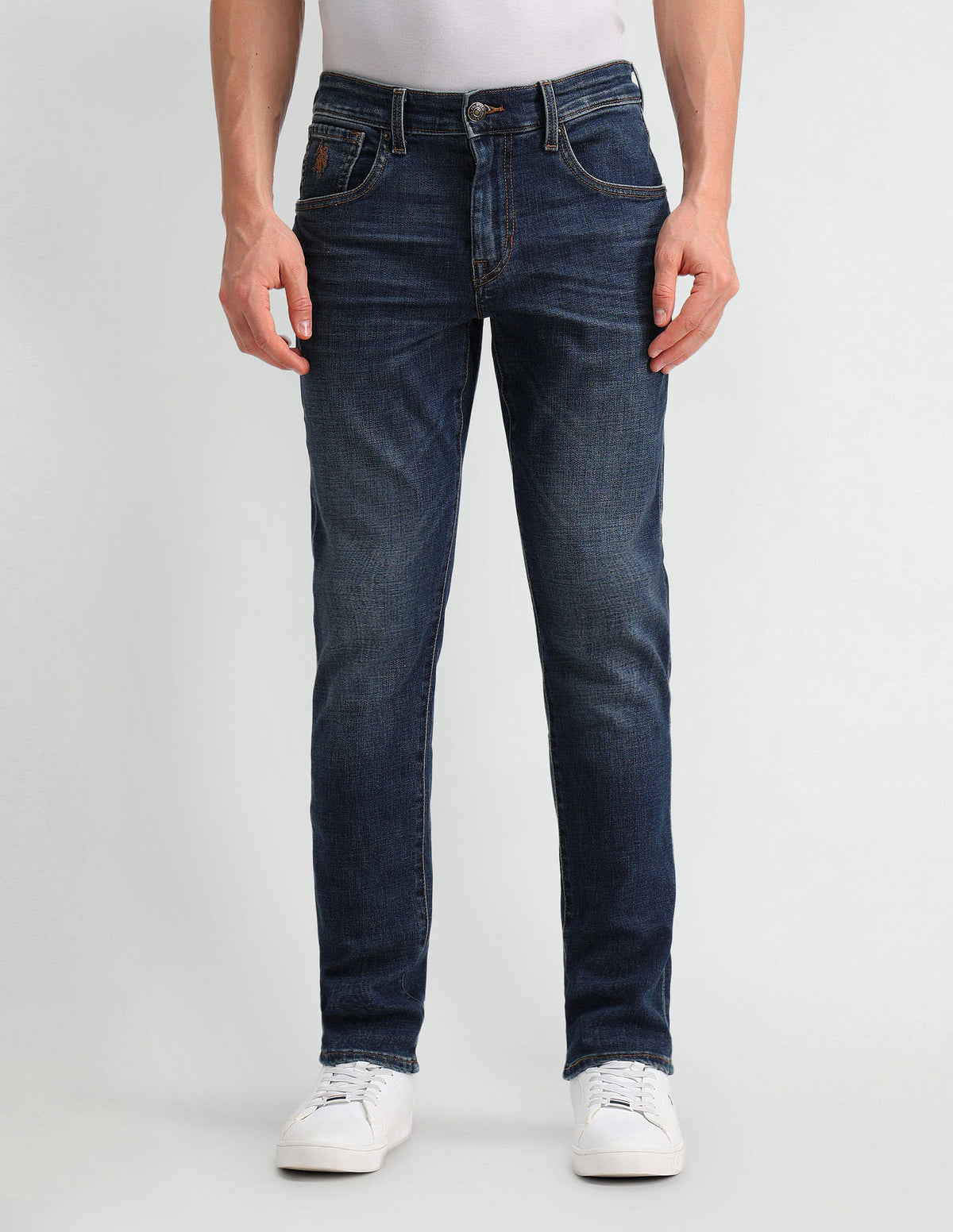 | Mid-rise waist | Button and zip fly closure | Five pockets | Stonewashed and whiskered | Denim weave | Brand fit: Brandon fit | Fit mapping: Slim tapered fit |