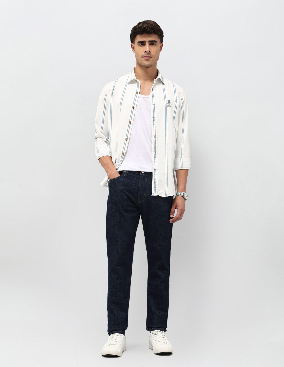Story: These men's jeans offer a Brandon Slim tapered fit with raw treatment in stretchable cotton for a minimalist, casual look.