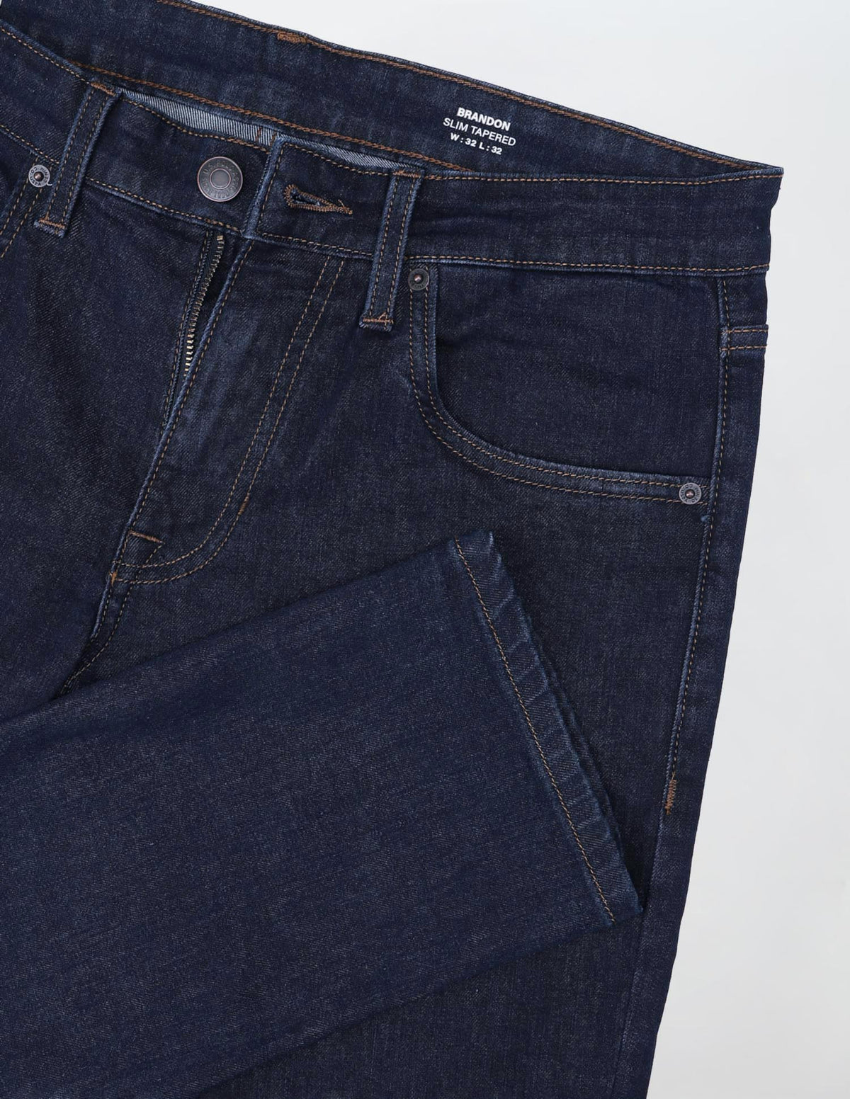 Story: Raw finish Brandon Slim tapered jeans crafted from flexible cotton blend for authentic style and comfortable all-day wear.