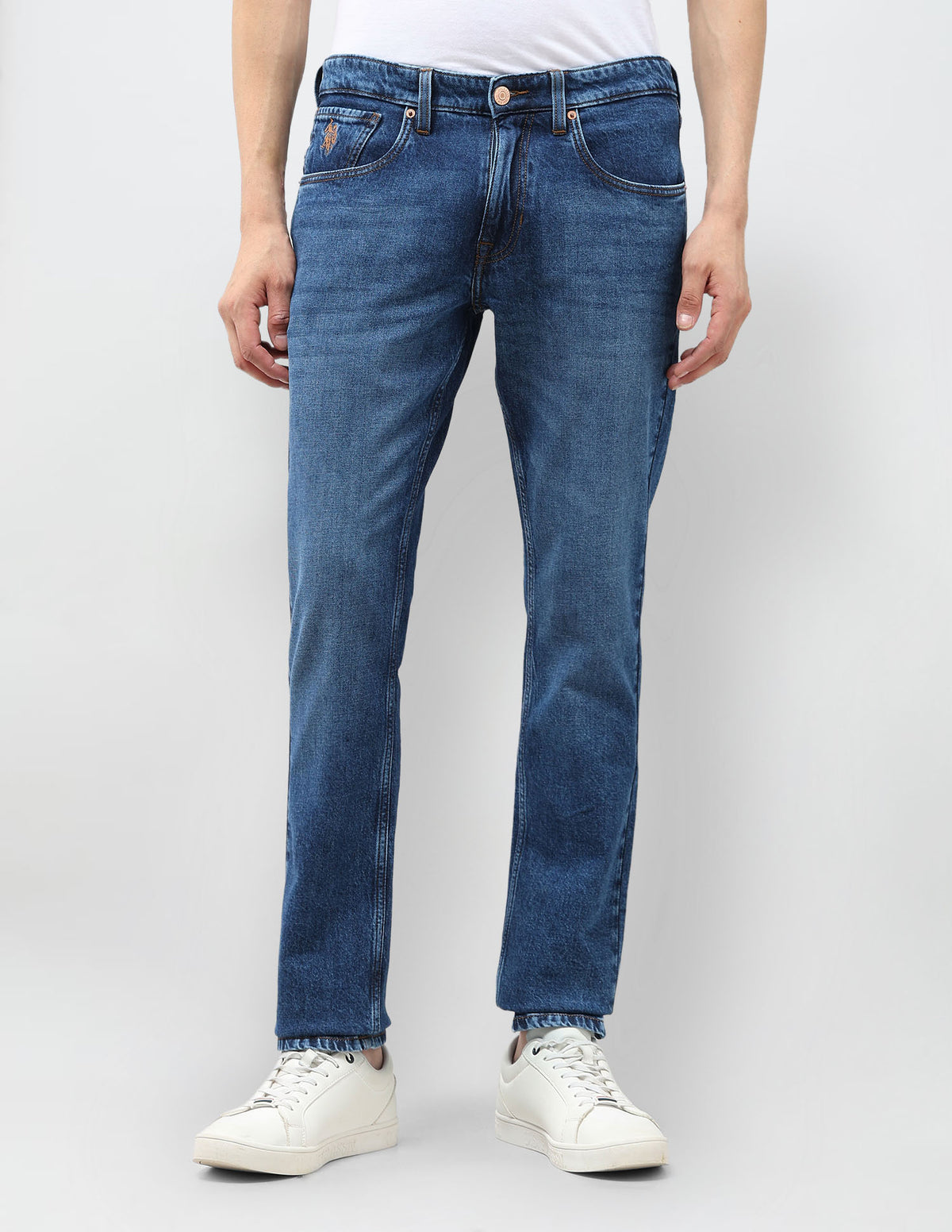 Story: Flexible cotton Brandon Slim tapered jeans with whiskered treatment, designed for comfortable movement and enduring casual style.