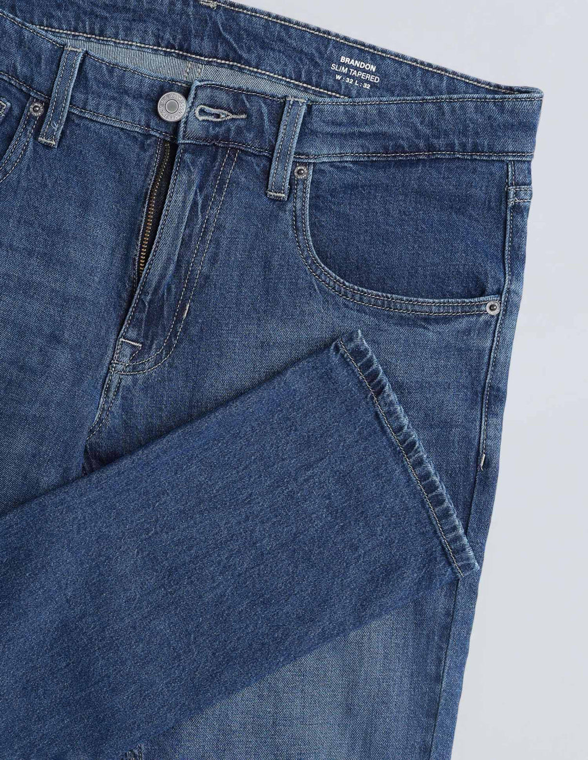 Story: Stretchable cotton jeans featuring Brandon Slim tapered fit with whiskered detailing for modern style and all-day comfortable wear.