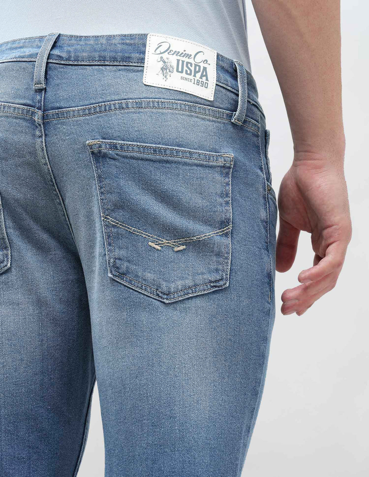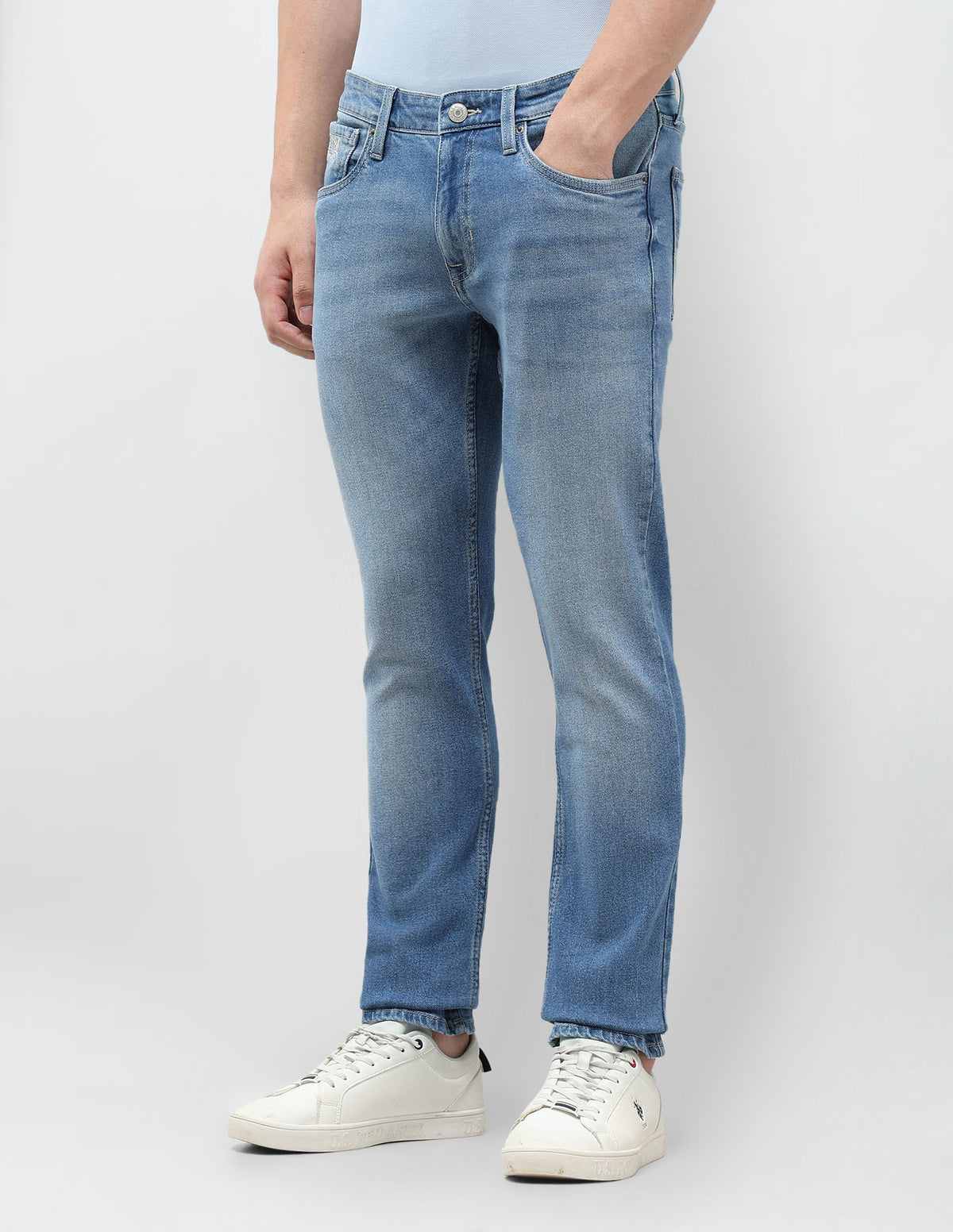Story: Stretchable cotton Brandon Slim tapered jeans featuring whiskered treatment for flexible movement and enduring casual denim style.
