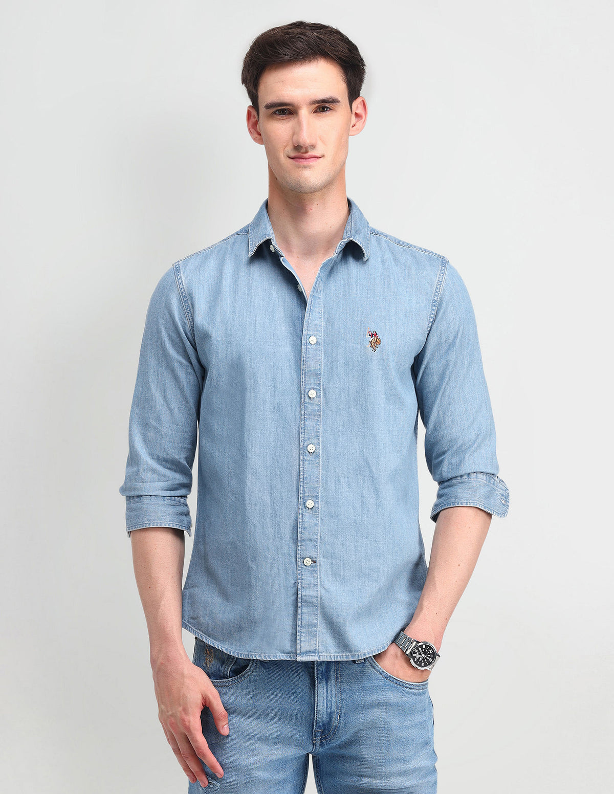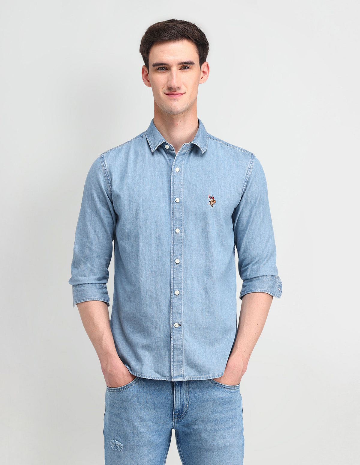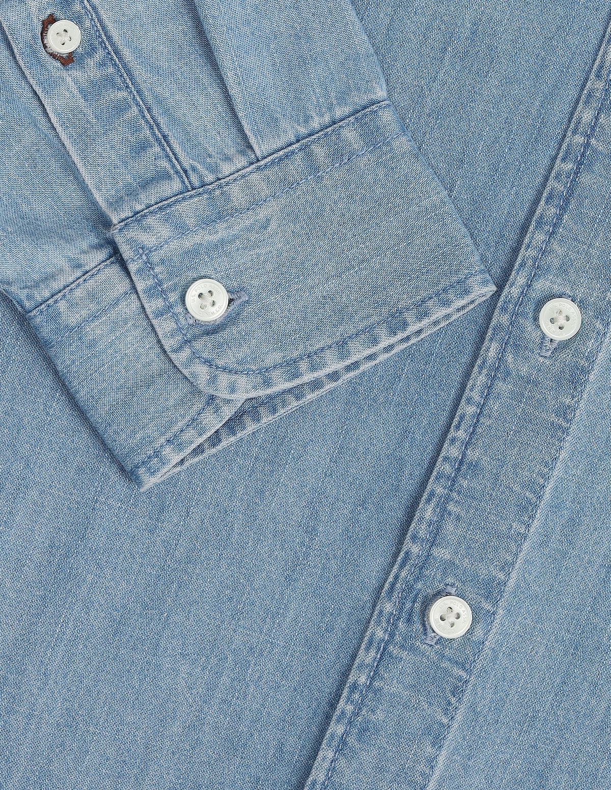 | Semi-cutaway collar | Logo at chest | Full button placket | Long sleeves with rounded cuffs | Curved hemline | Washed pattern | Chambray weave | Slim fit