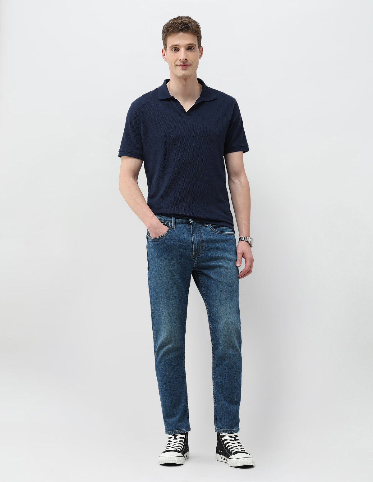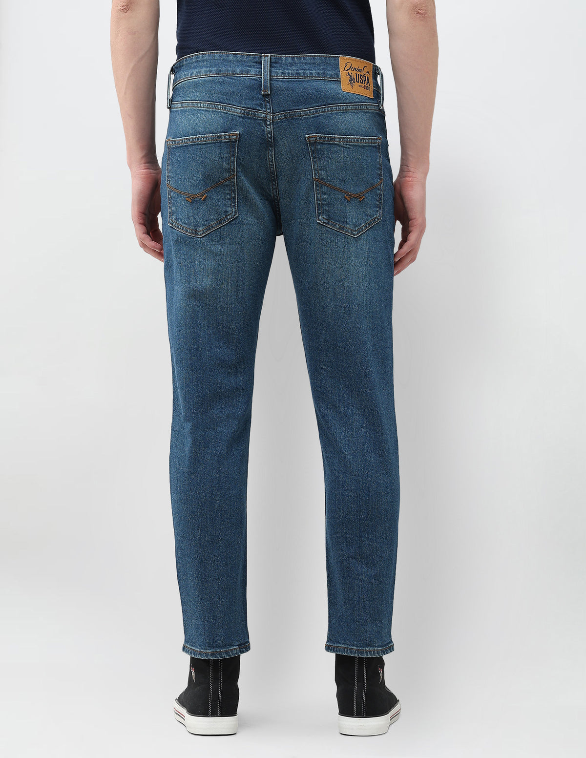 Story: Stone-washed five-pocket denim in a Cole comfort cropped fit combines stretchable cotton ease with a modern casual silhouette for men.