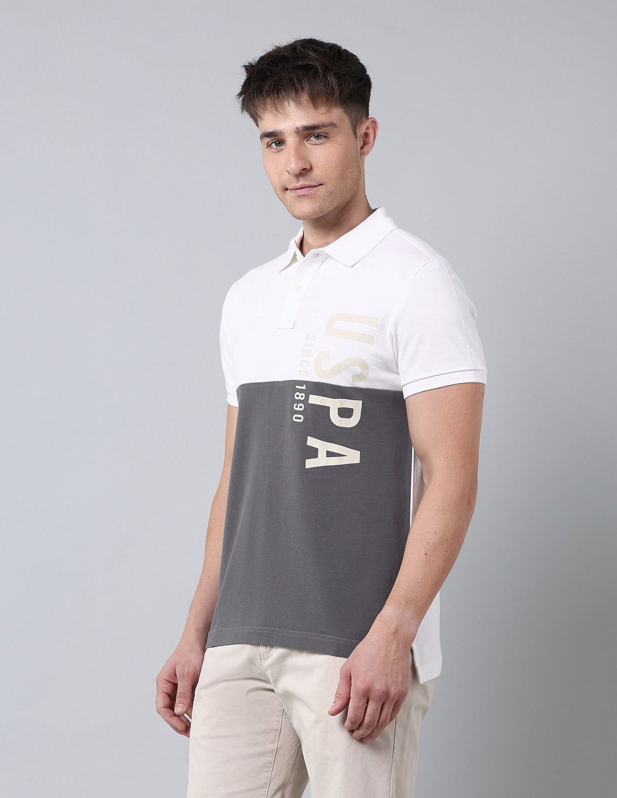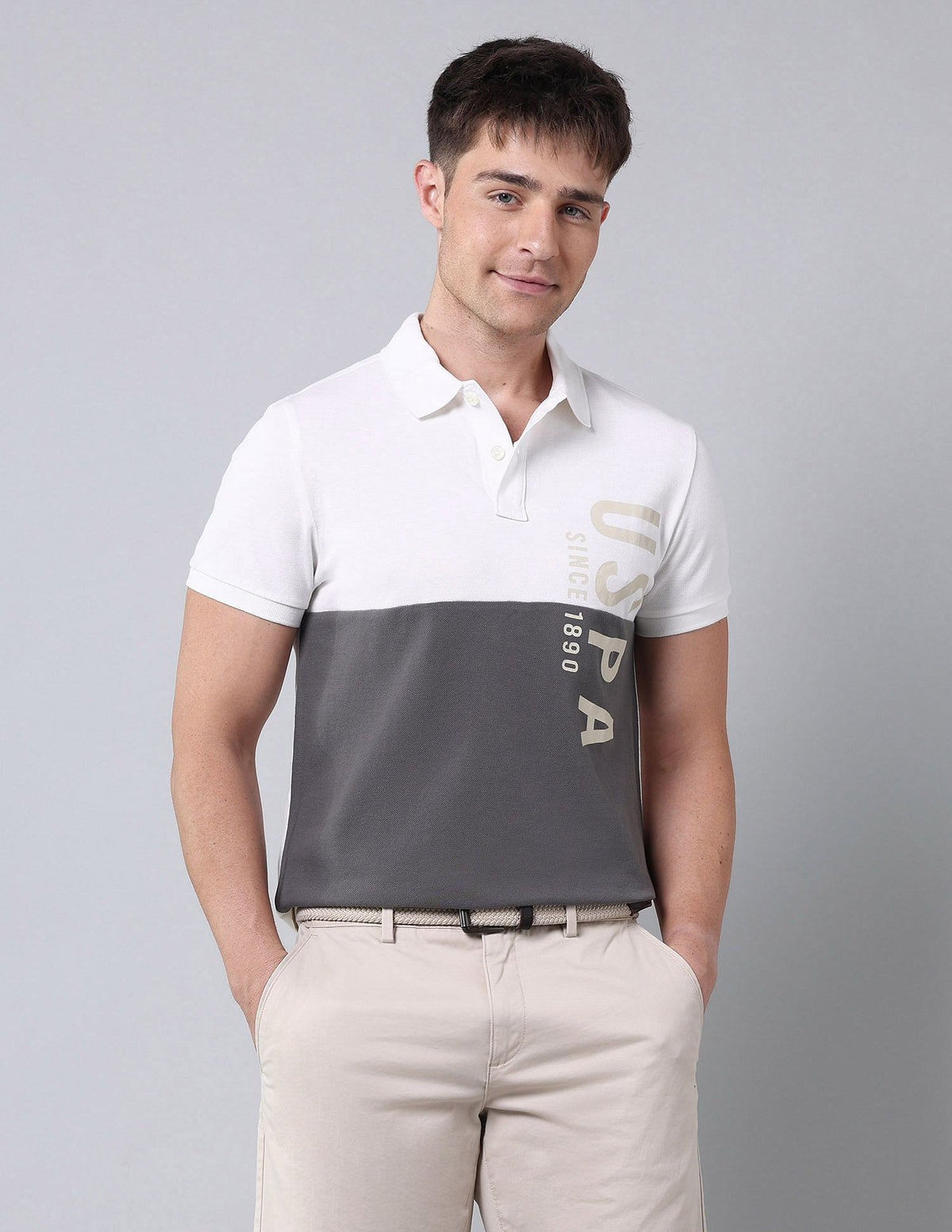 | Polo collar | Short button placket | Short sleeves | Ribbed collar and sleeve hems | Uneven vented hem | Brand printed and colourblocked pattern | Pique knit | Muscle fit |