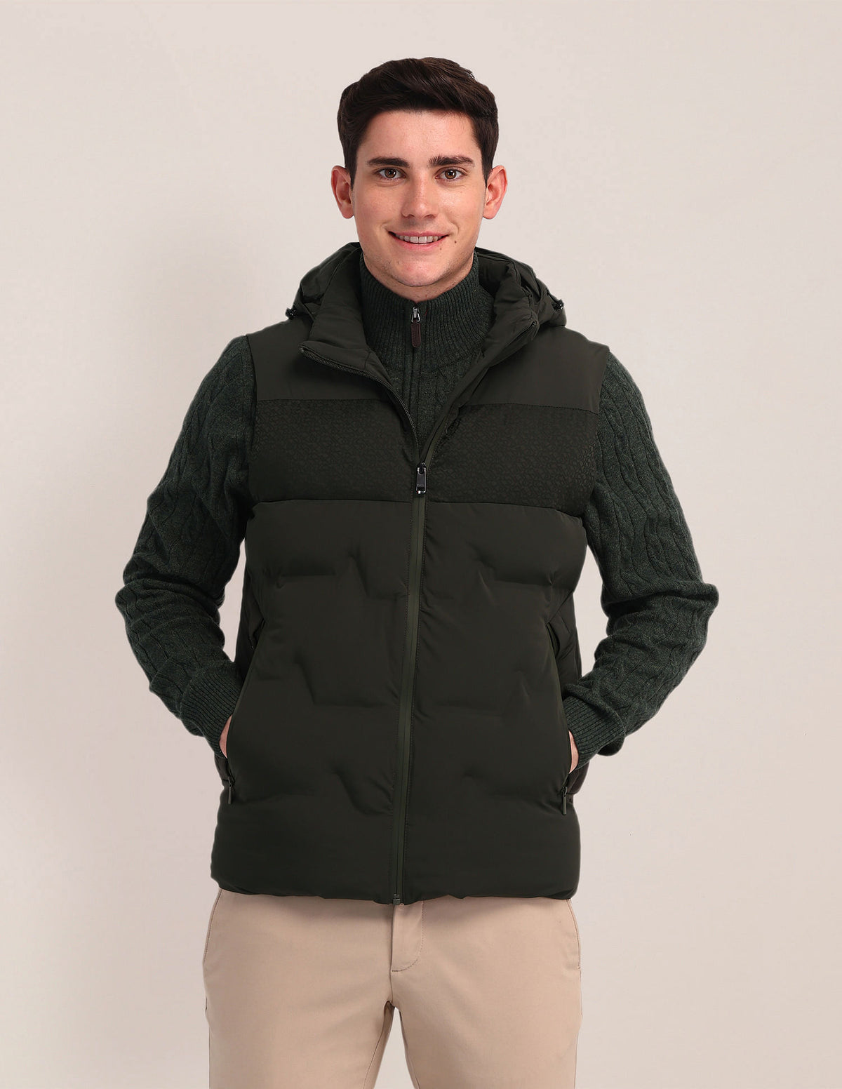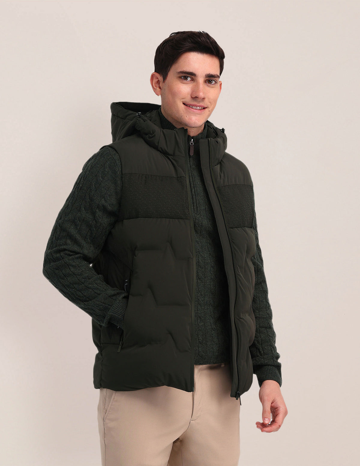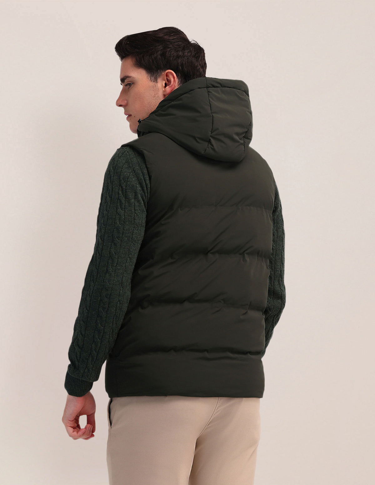 | Detachable hood | High neck | Logo at chest | Full zipper closure | Sleeveless | Two pockets | Padded construction | Solid pattern | Regular fit |