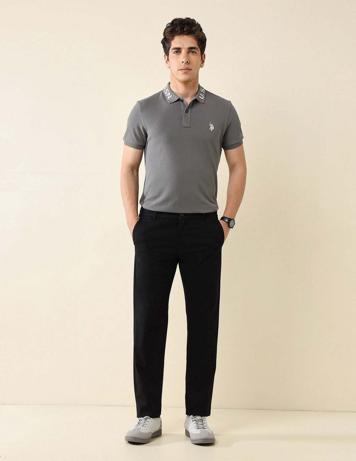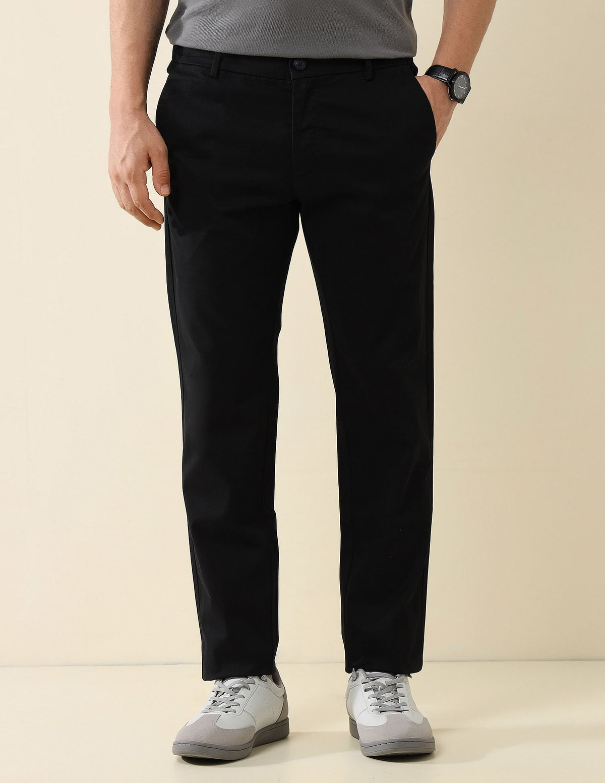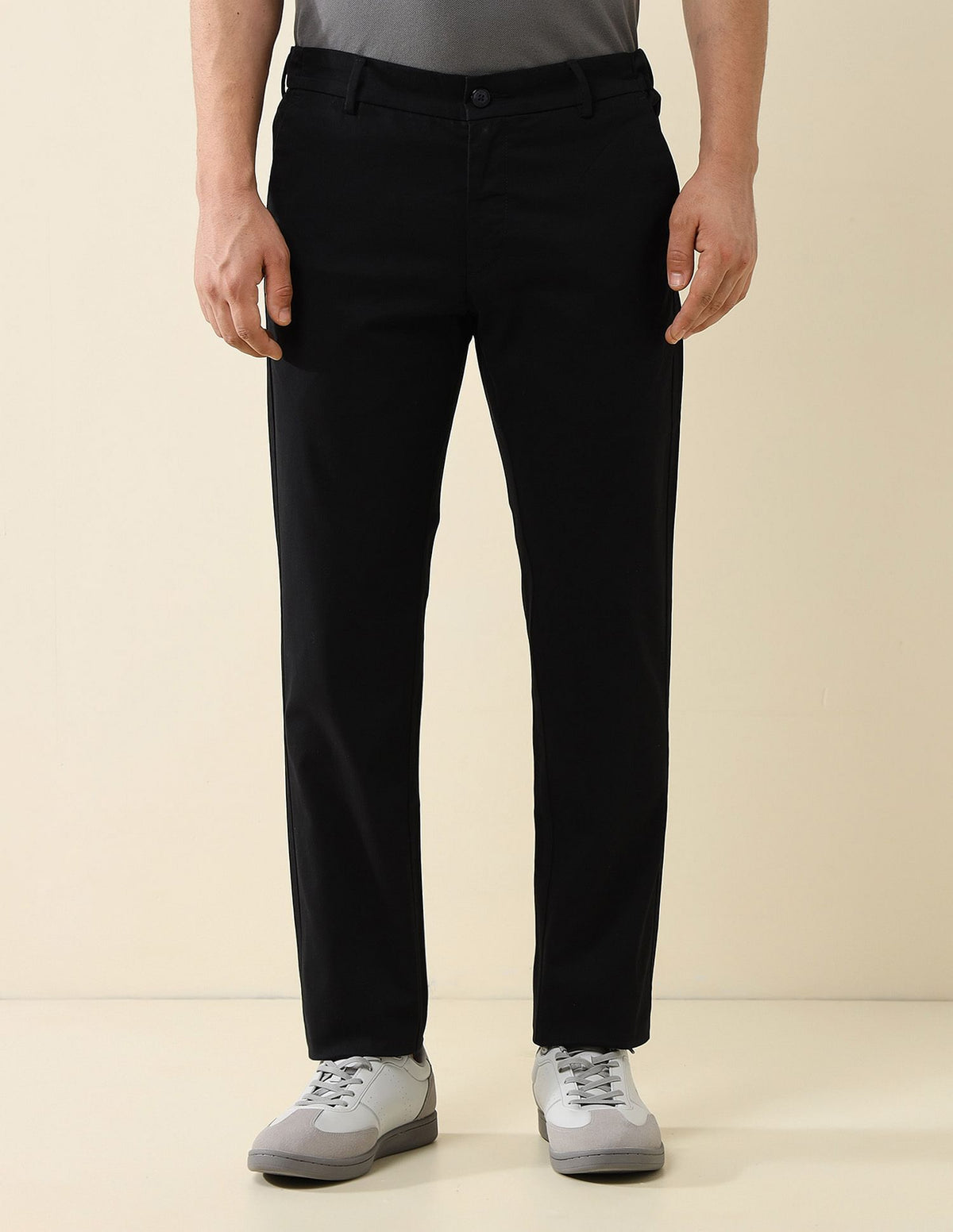 | Mid-rise with elasticized waist on sides | Button and zip fly closure | Four pockets | Flat front | Solid pattern | Twill weave | Slim fit |