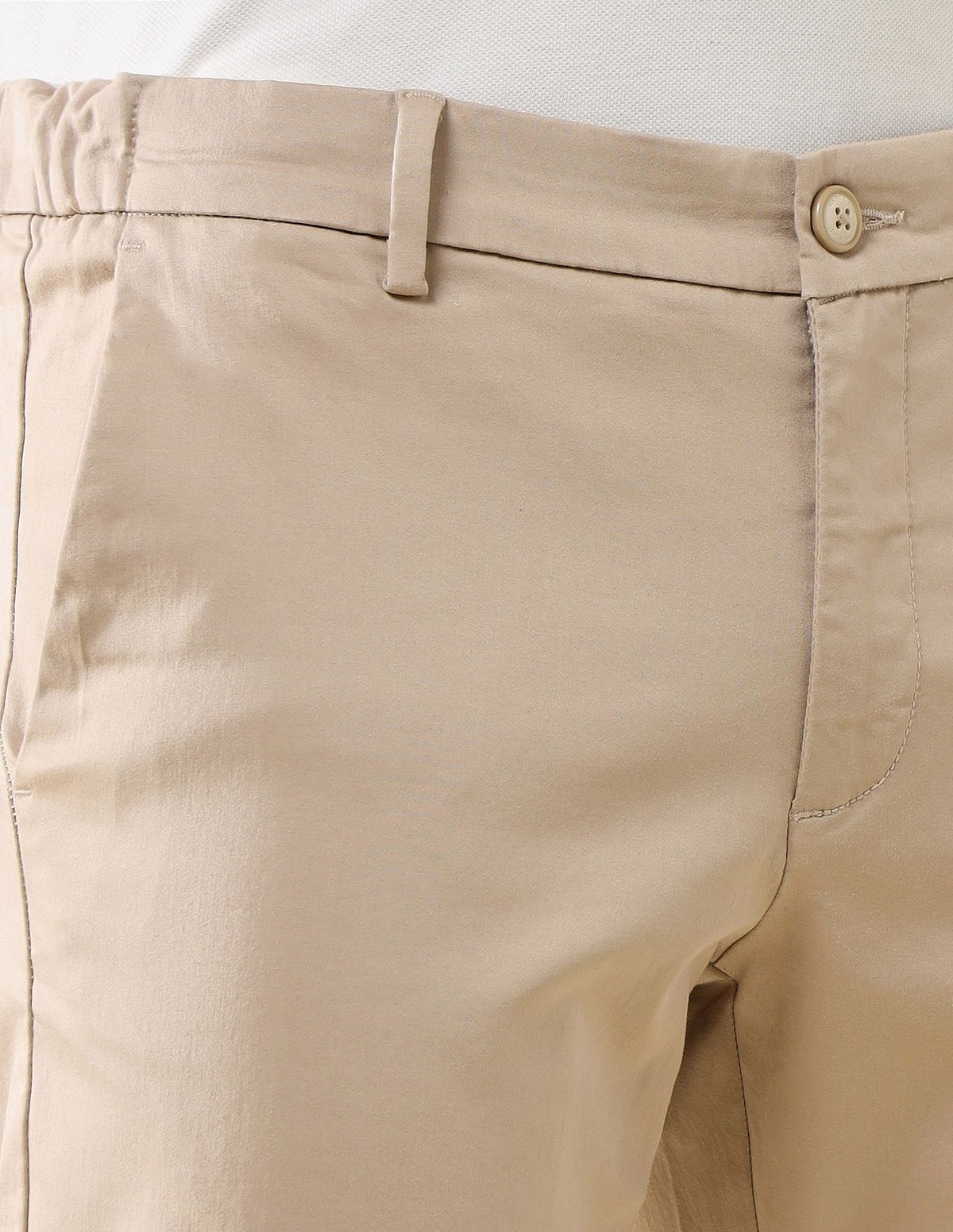 | Mid-rise with elasticized waist on sides | Button and zip fly closure | Four pockets | Flat front | Solid pattern | Twill weave | Slim fit |