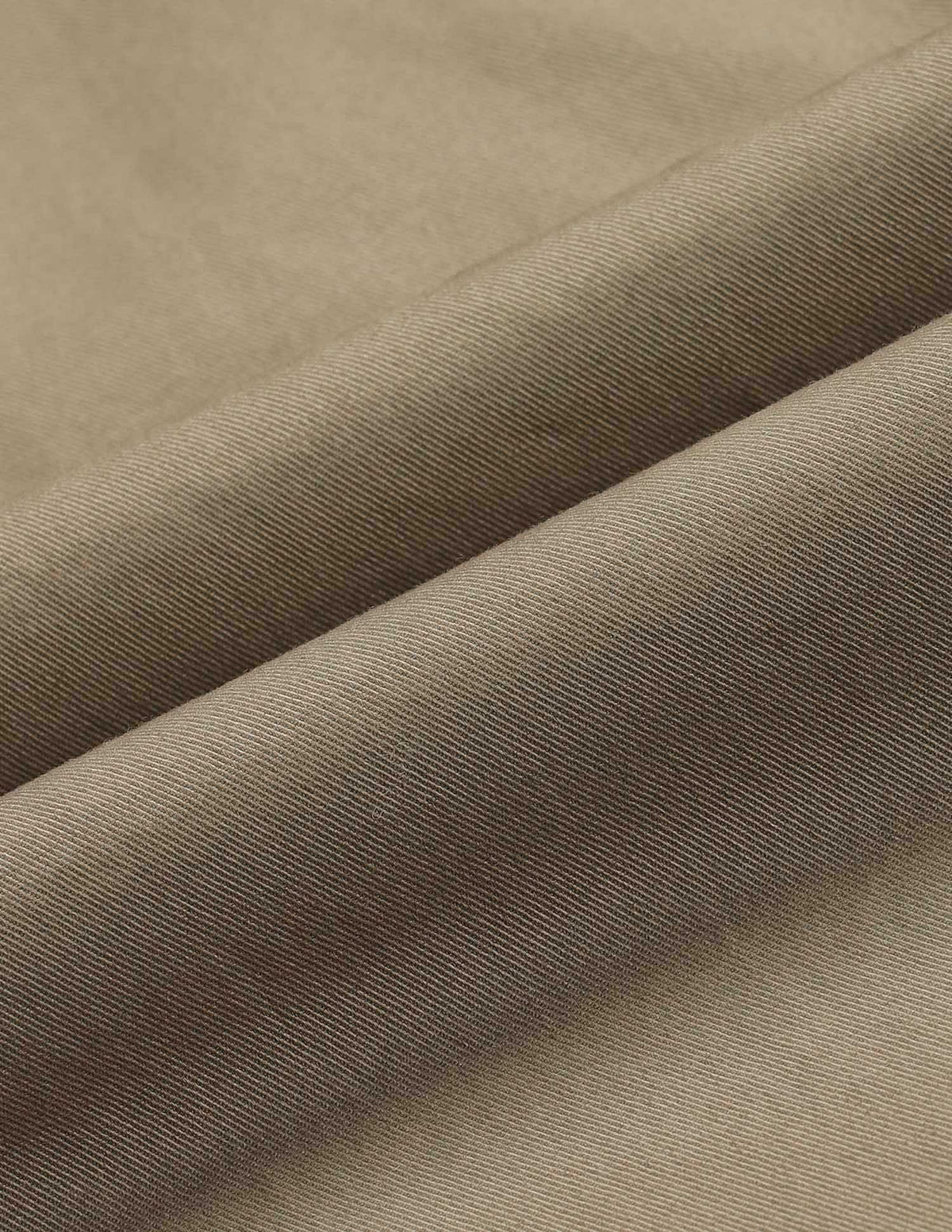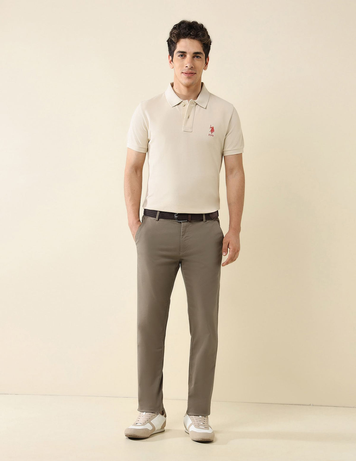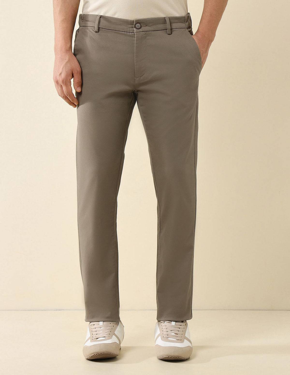 | Mid-rise with elasticized waist on sides | Button and zip fly closure | Four pockets | Flat front | Solid pattern | Twill weave | Super slim fit |