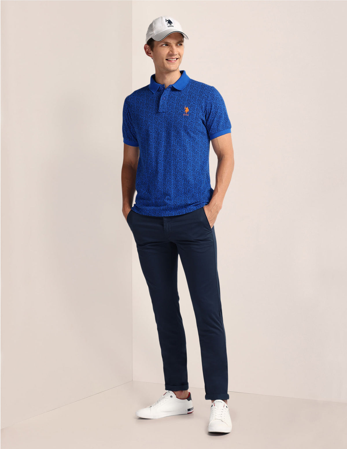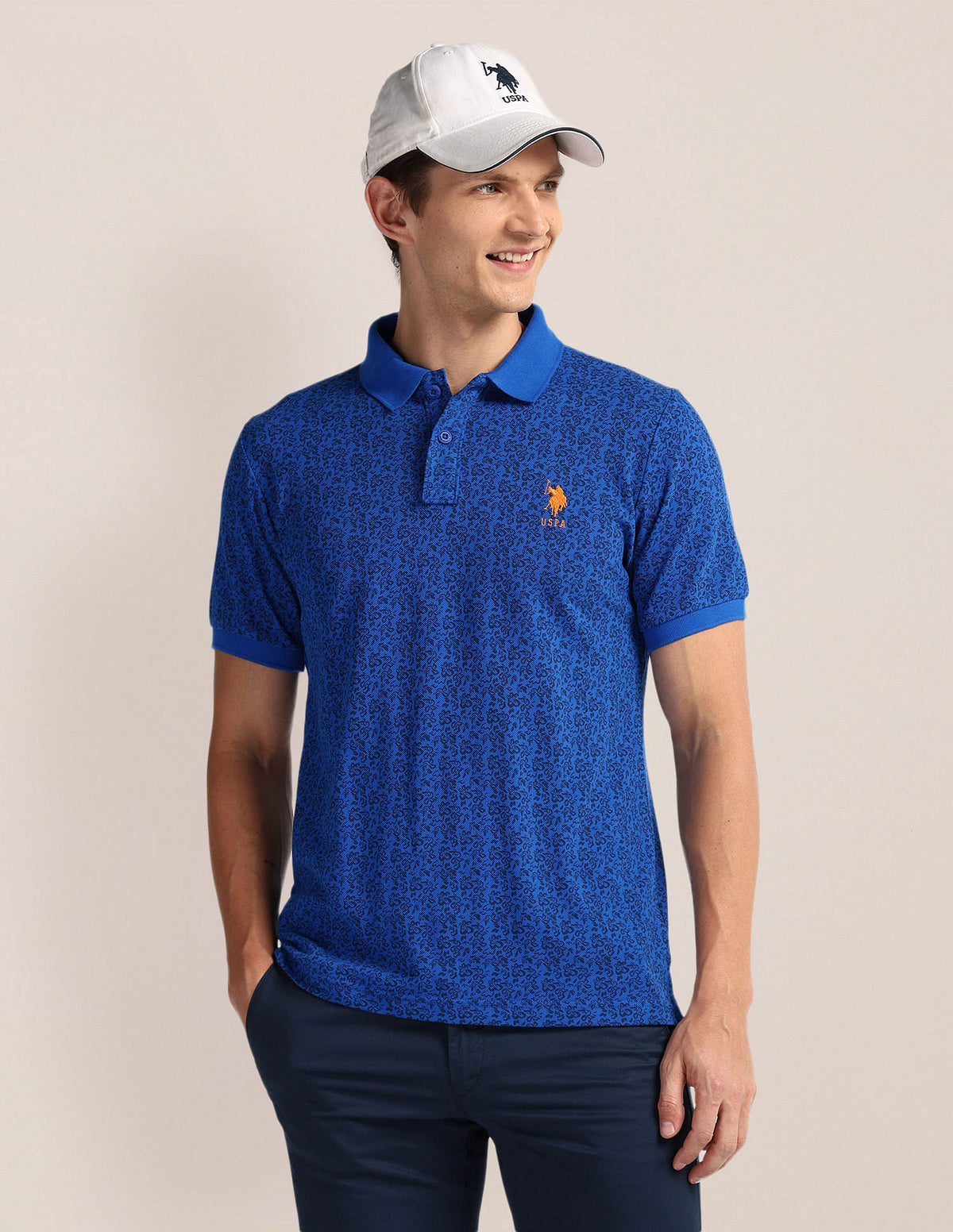| Polo collar | Logo at chest | Short button placket | Short sleeves | Ribbed collar and sleeve hems | Uneven vented hem | Floral printed pattern | Knitted | Slim fit