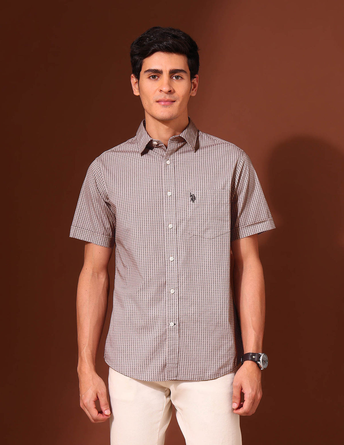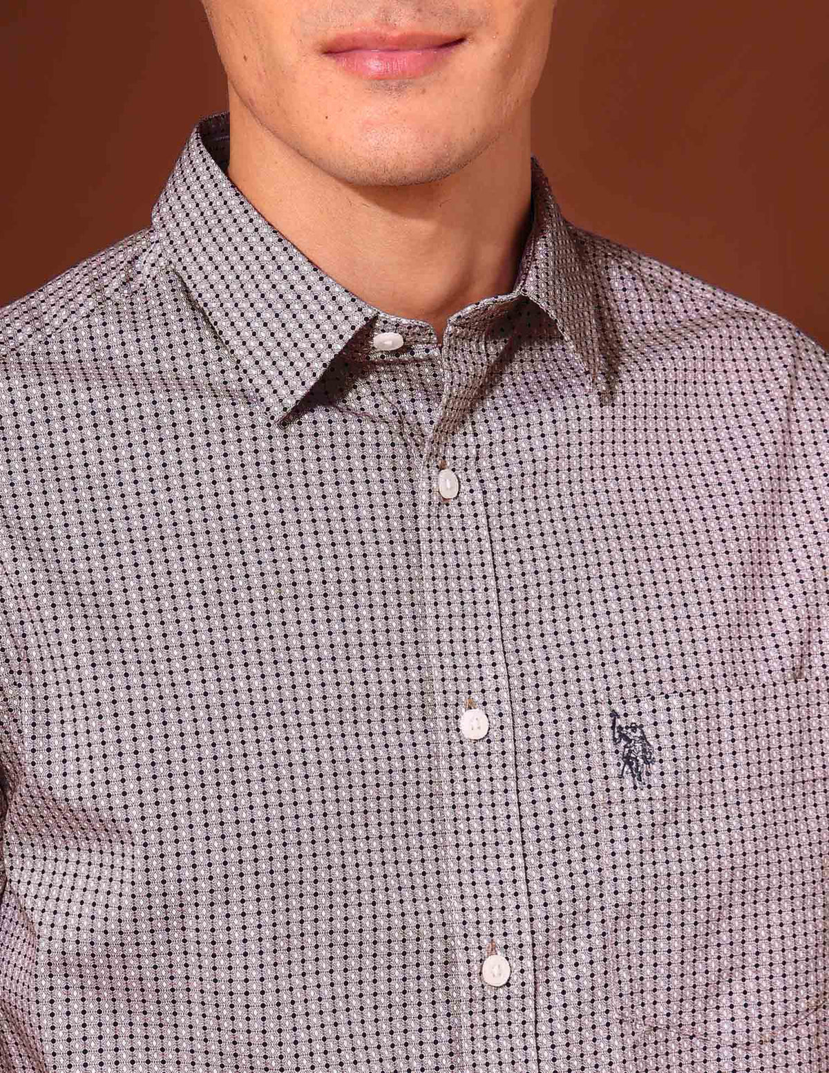 Story: Stand out in this geometric-patterned men's shirt, ideal for adding visual interest to casual outfits.