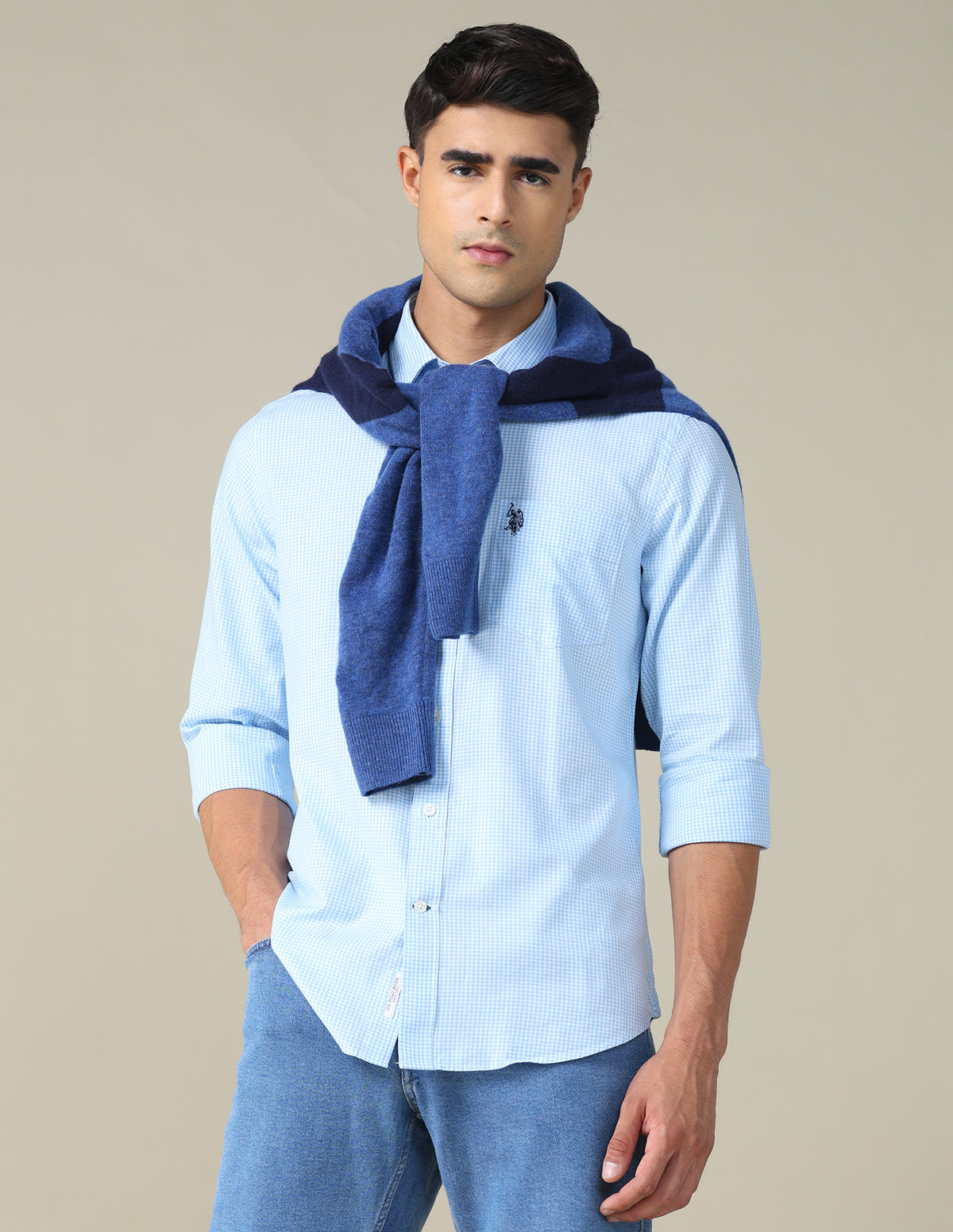 Story: Men's casual oxford checks shirt, offering a classic and refined look for various informal settings.