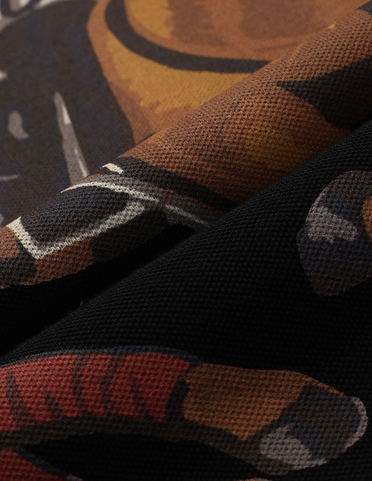 | Polo collar | Logo at chest | Short button placket | Short sleeves | Ribbed collar and sleeve hems | Uneven vented hem | Graphic printed pattern | Knitted | Muscle fit