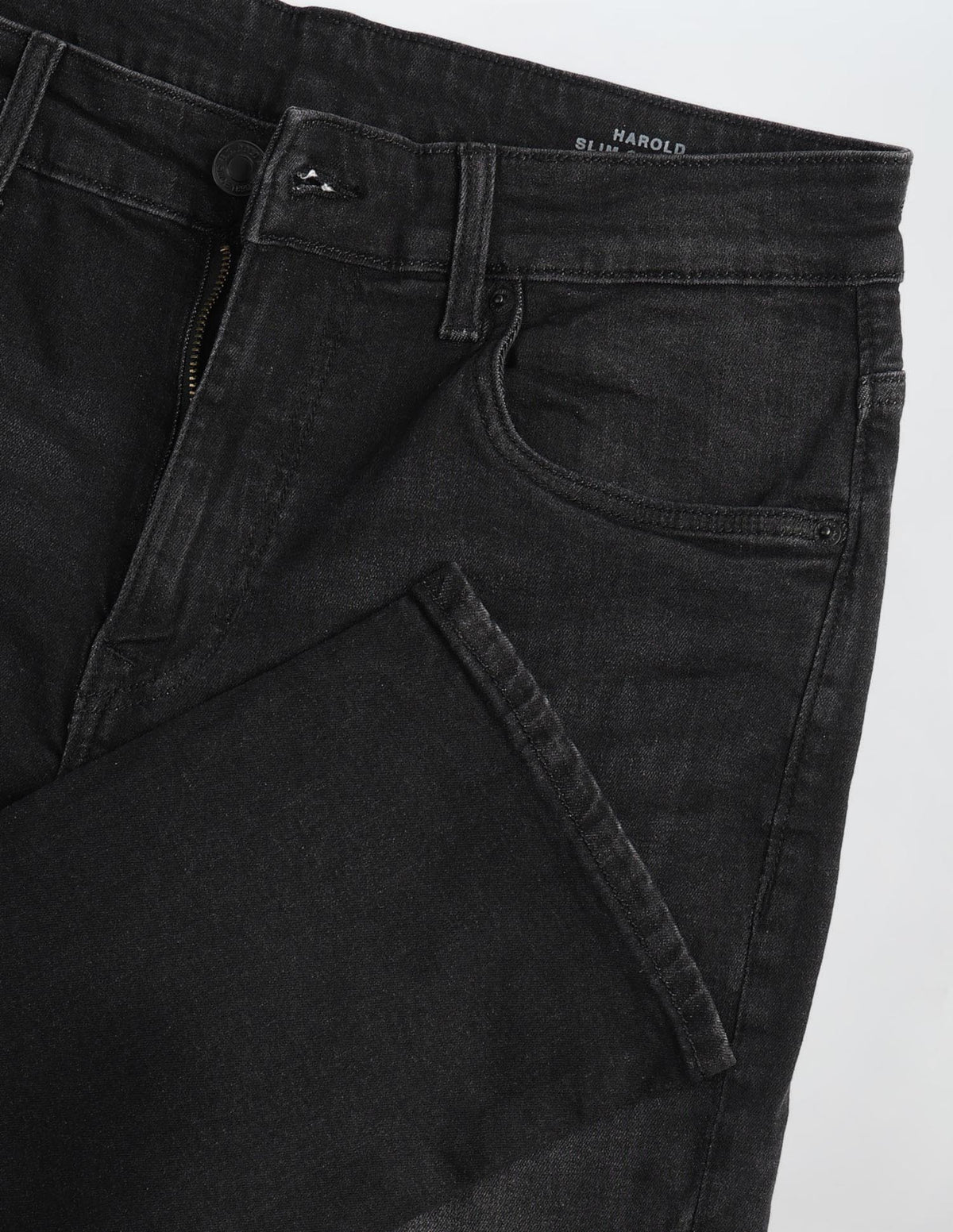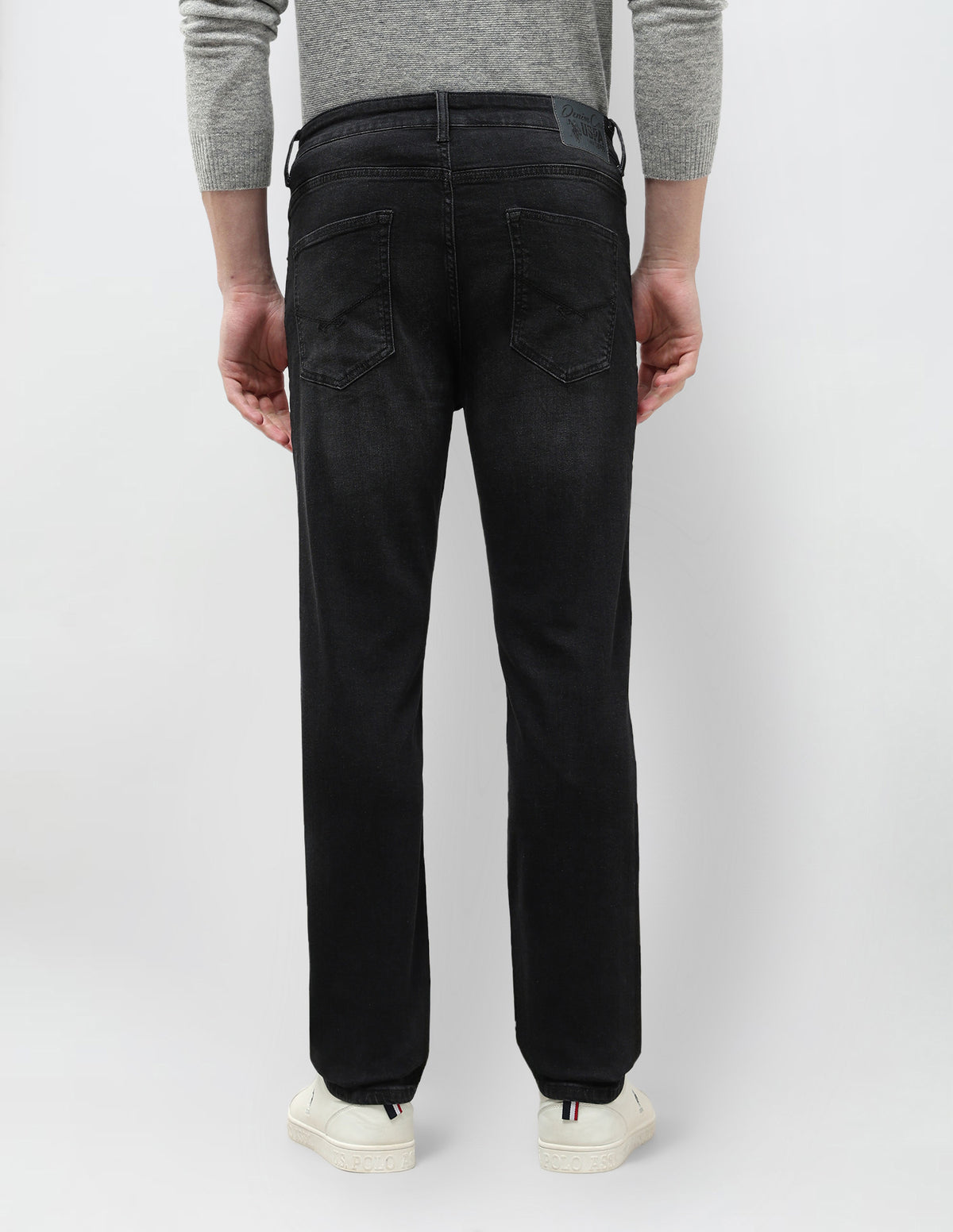 Story: These washed black men's jeans feature a solid pattern, perfect for casual occasions, offering a sleek and versatile look for everyday wear.