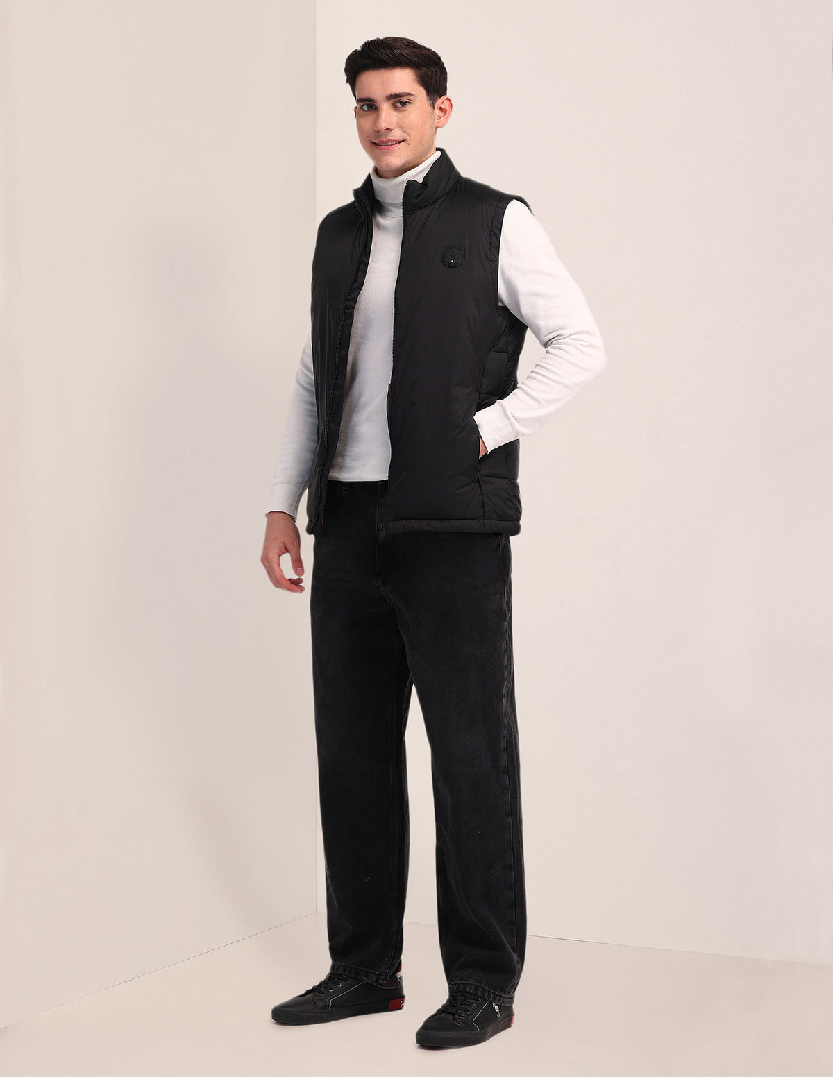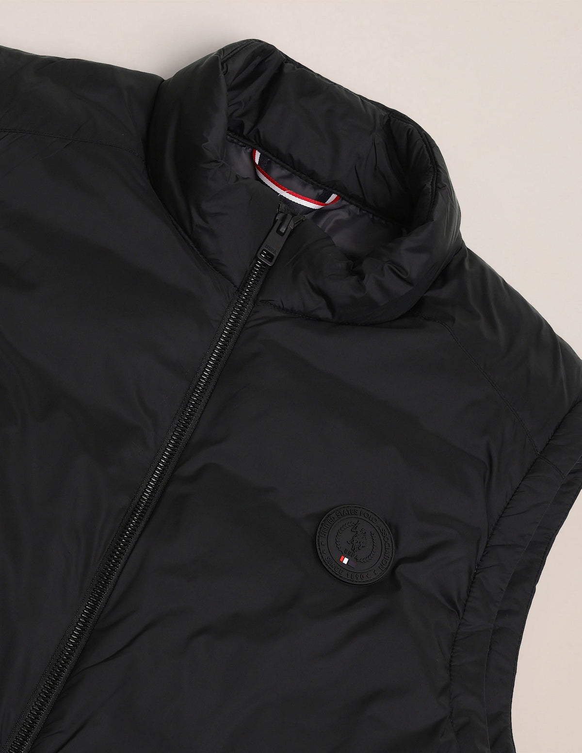 | High neck | Logo at chest | Full zipper closure | Sleeveless | Two pockets | Quilted construction | Solid pattern | Regular fit |