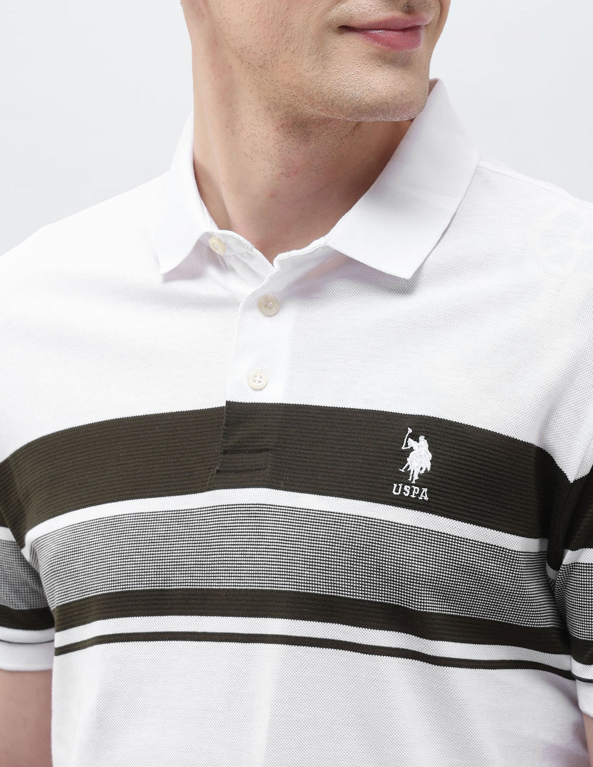 Story: Featuring horizontal stripes, this men’s half sleeve polo T-shirt offers casual comfort with a sporty appeal for relaxed weekends and daily use.