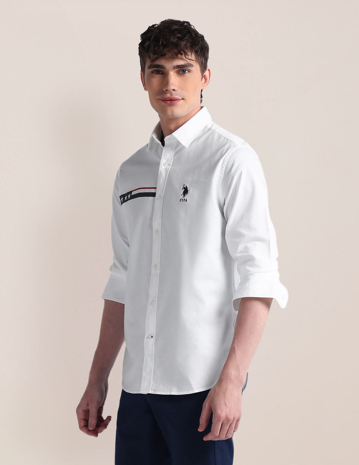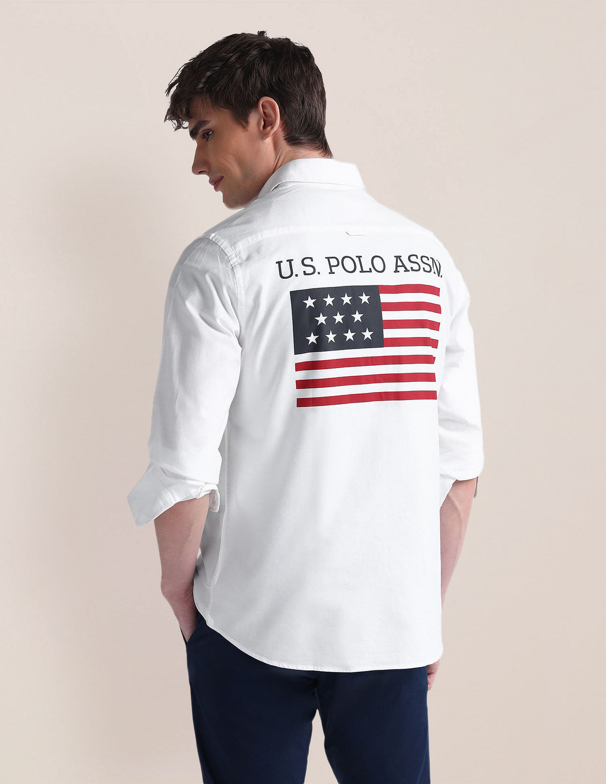 | Semi-cutaway collar | Logo at chest | Full button placket | Long sleeves with rounded cuffs | Curved hemline | Graphic printed pattern | Regular weave | Brand fit: Tailored fit | Fit mapping: Regular fit |