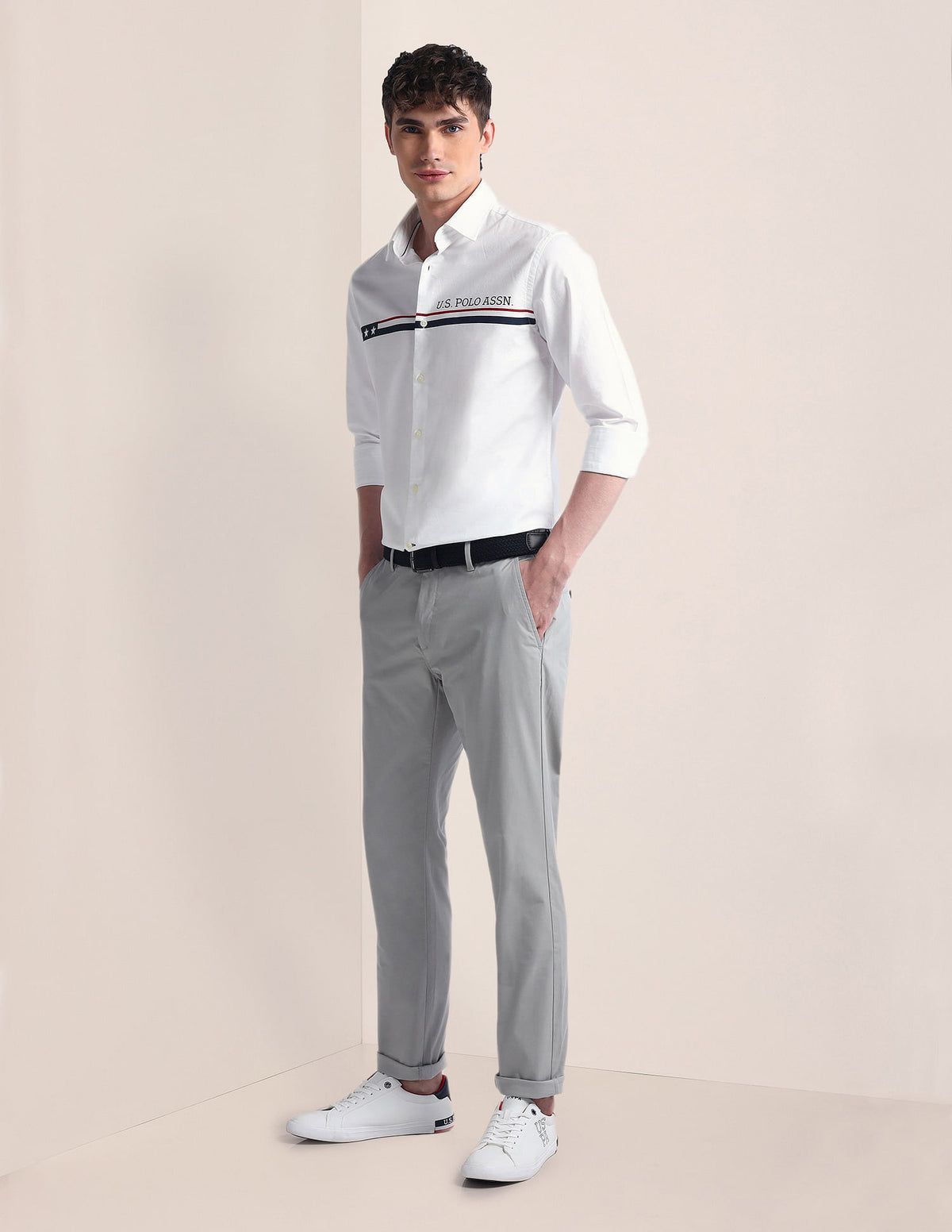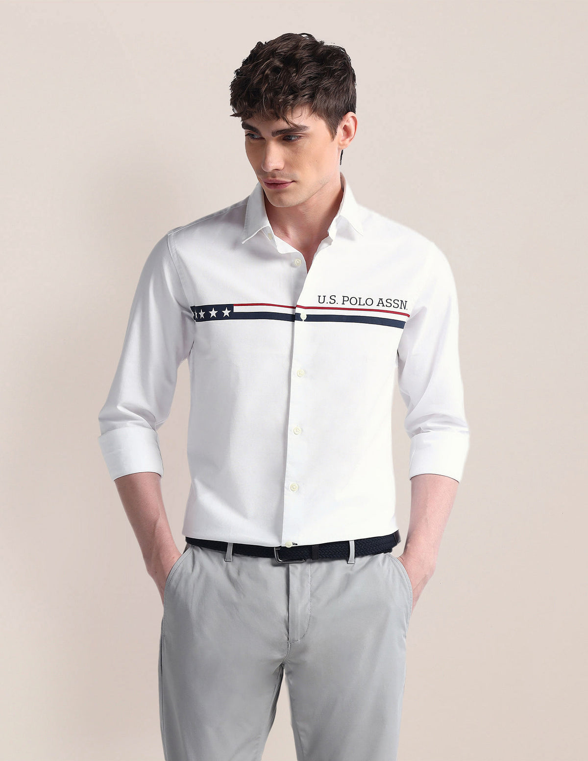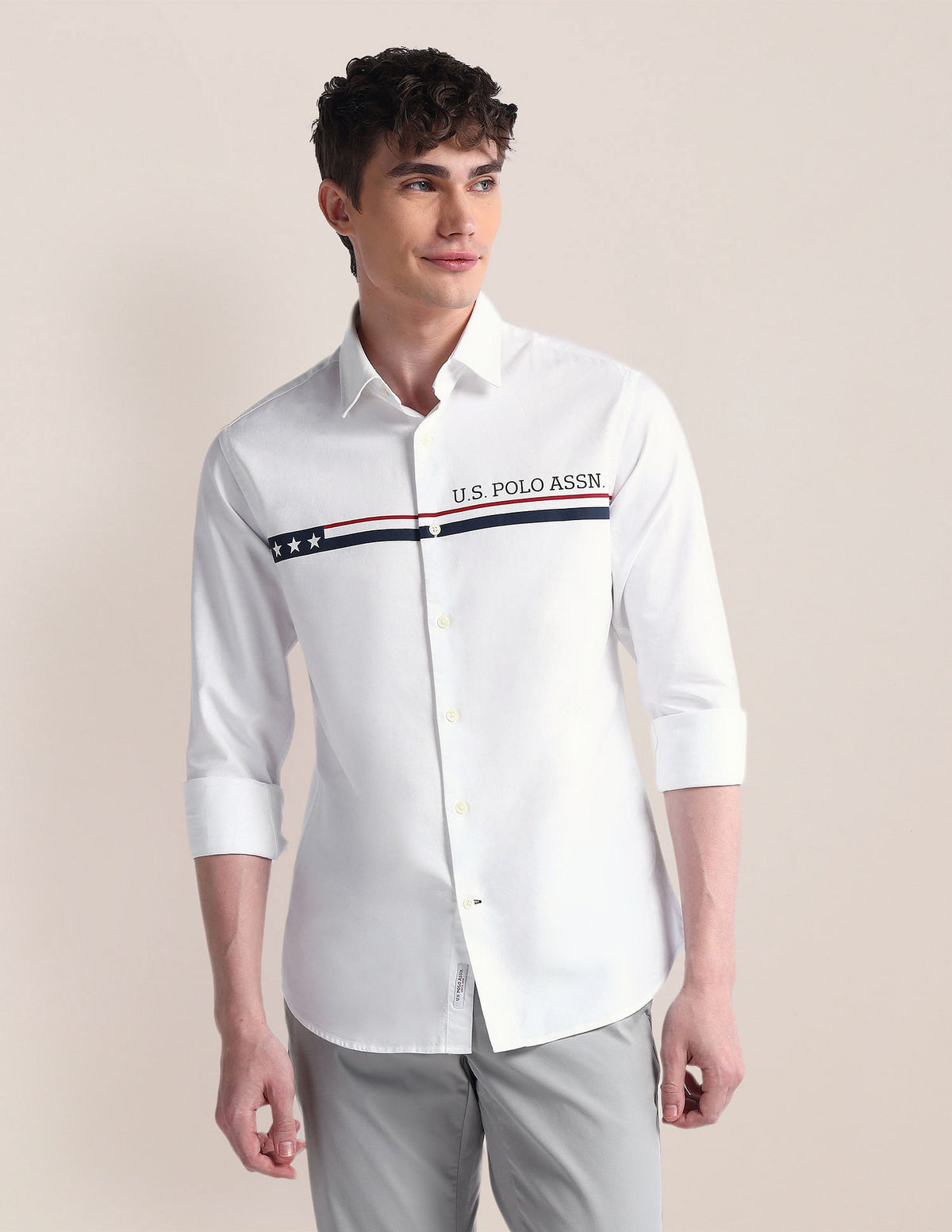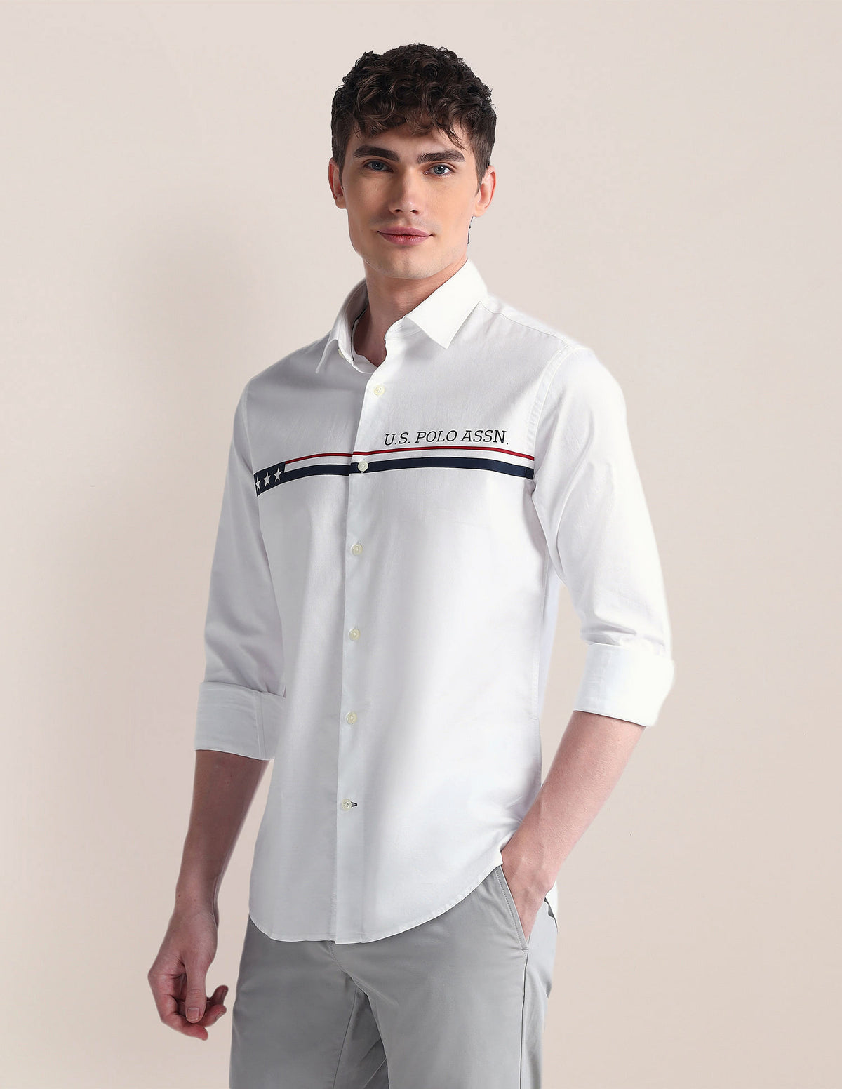 | Semi-cutaway collar | Logo at chest | Full button placket | Long sleeves with rounded cuffs | Curved hemline | Solid pattern | Regular weave | Brand fit: Tailored fit | Fit mapping: Regular fit