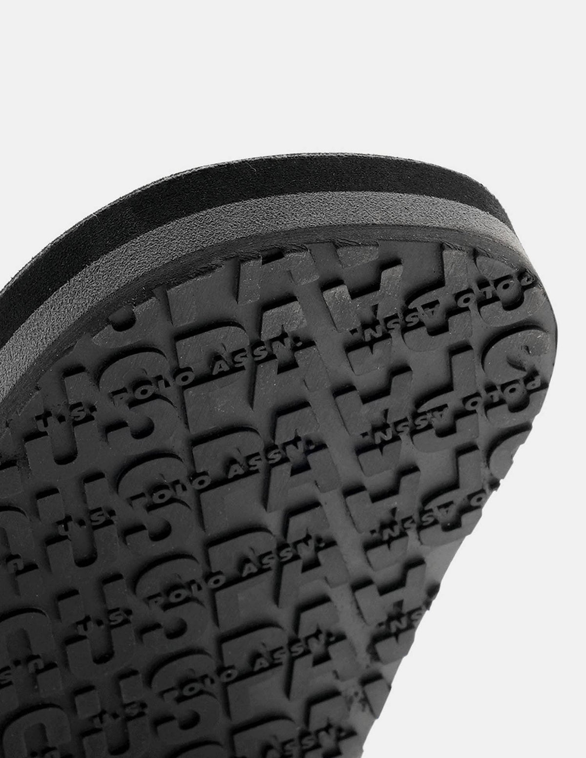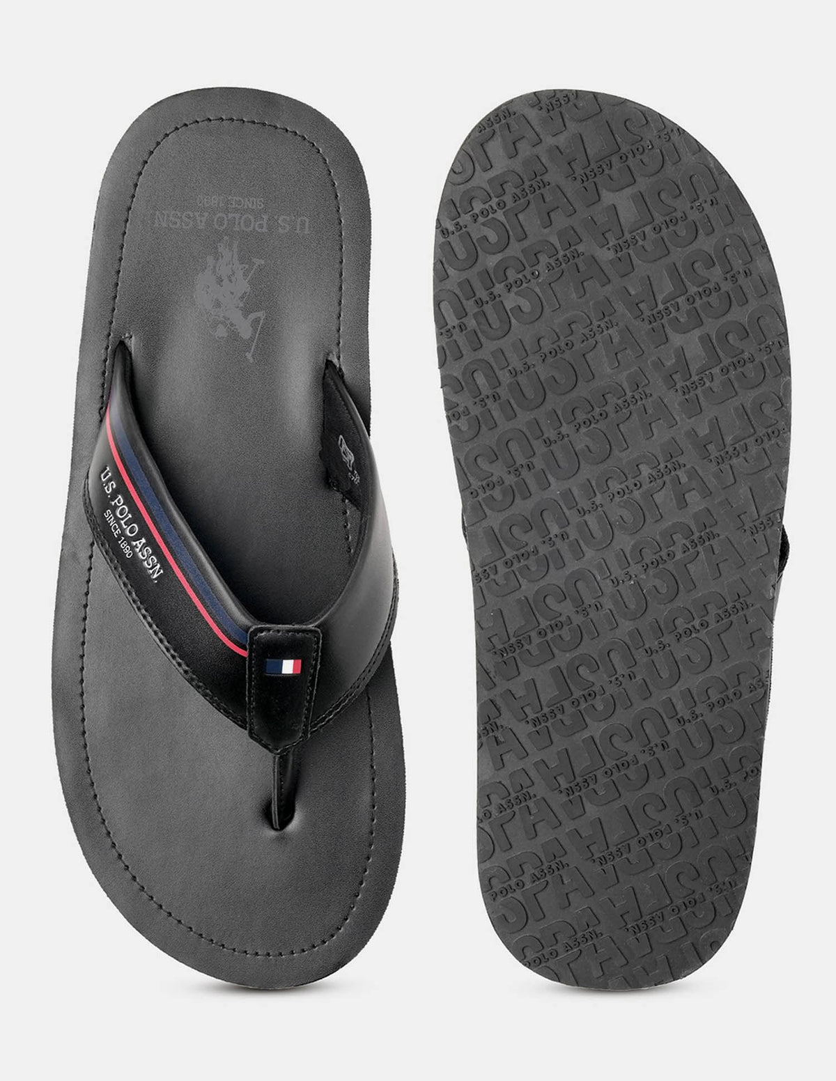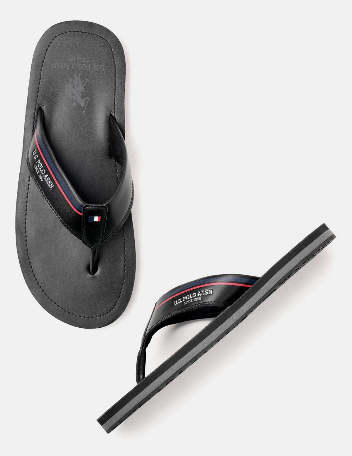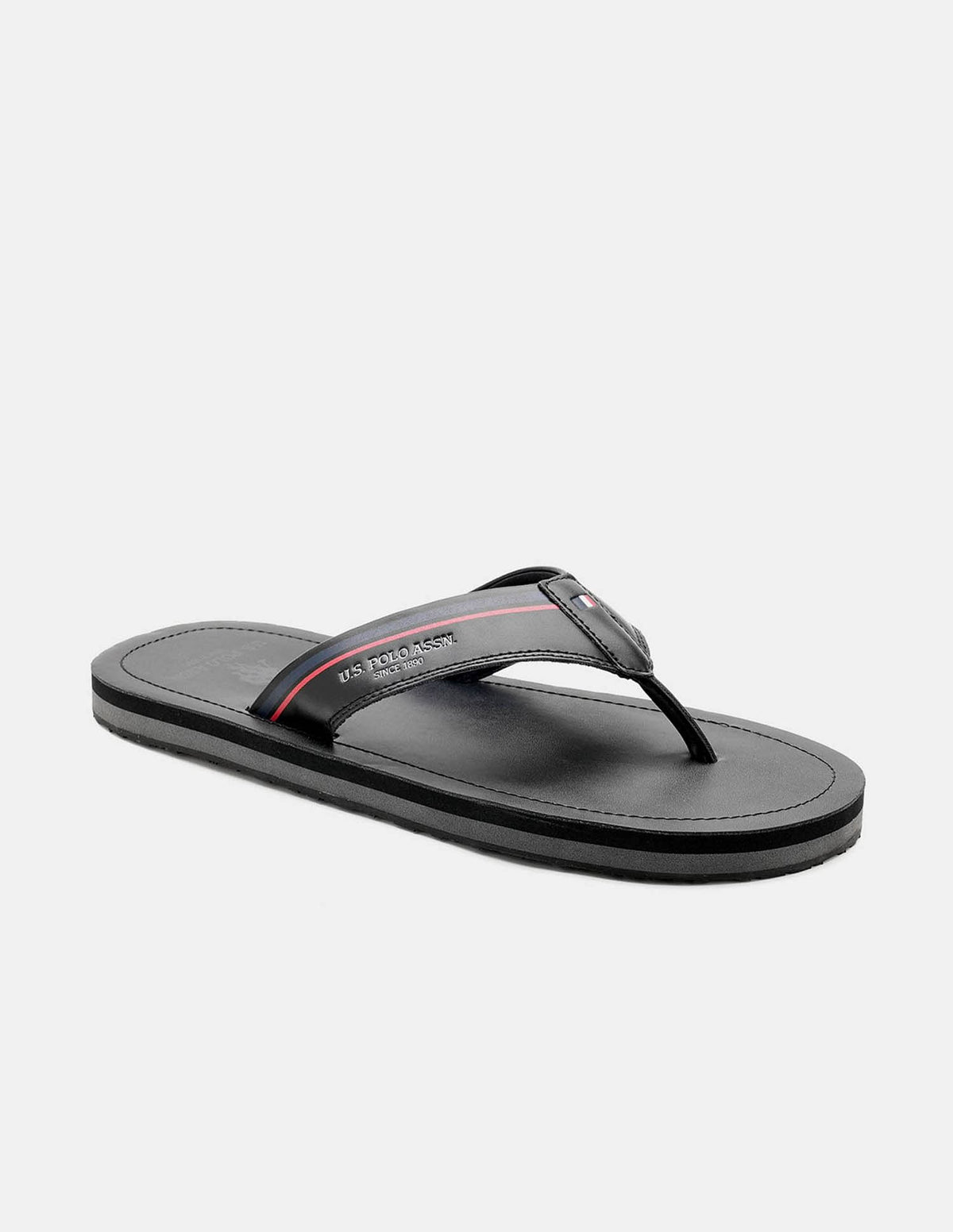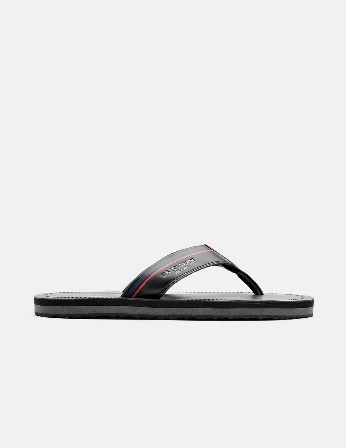 | Broad striped V-strap with branding | Cushioned footbed | Textured outsole | Solid pattern |