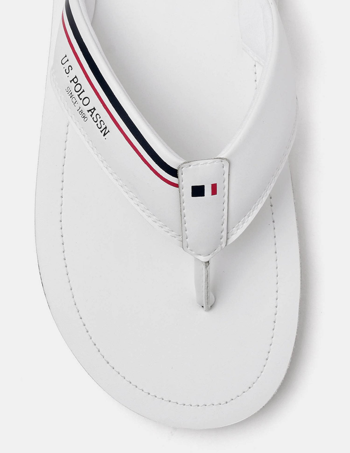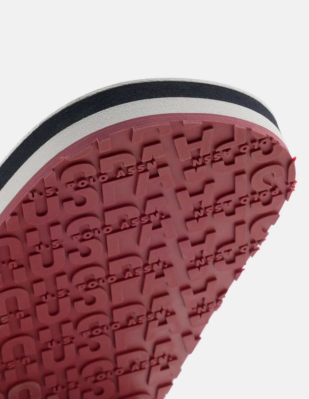 | Broad striped V-strap with branding | Cushioned footbed | Textured outsole | Solid pattern |