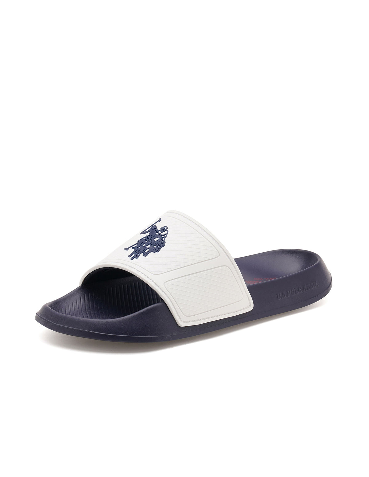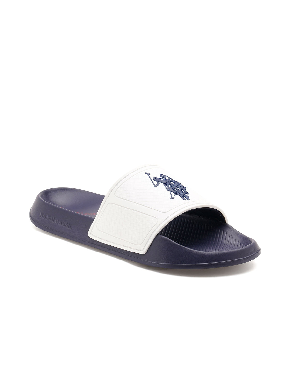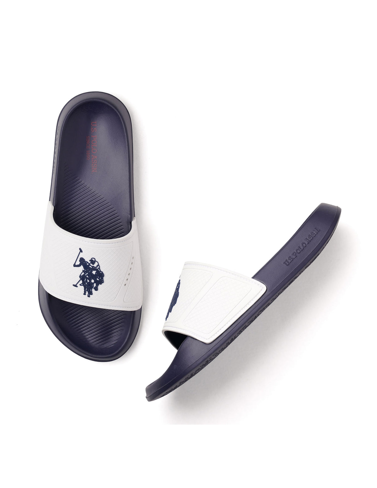 | Open toe | Logo at vamp strap | Cushioned insole with logo | Textured outsole | Brand printed pattern |