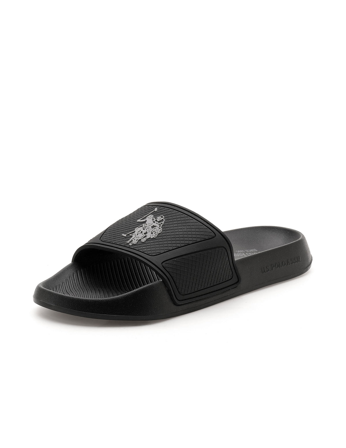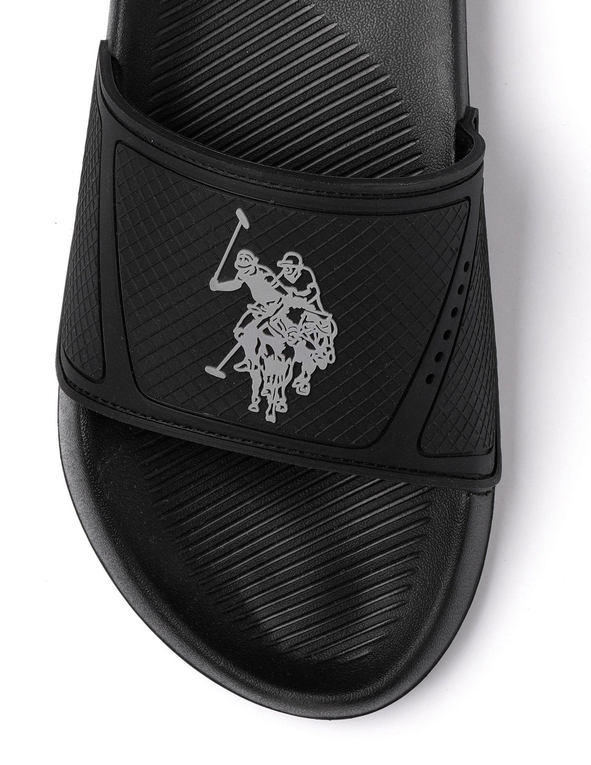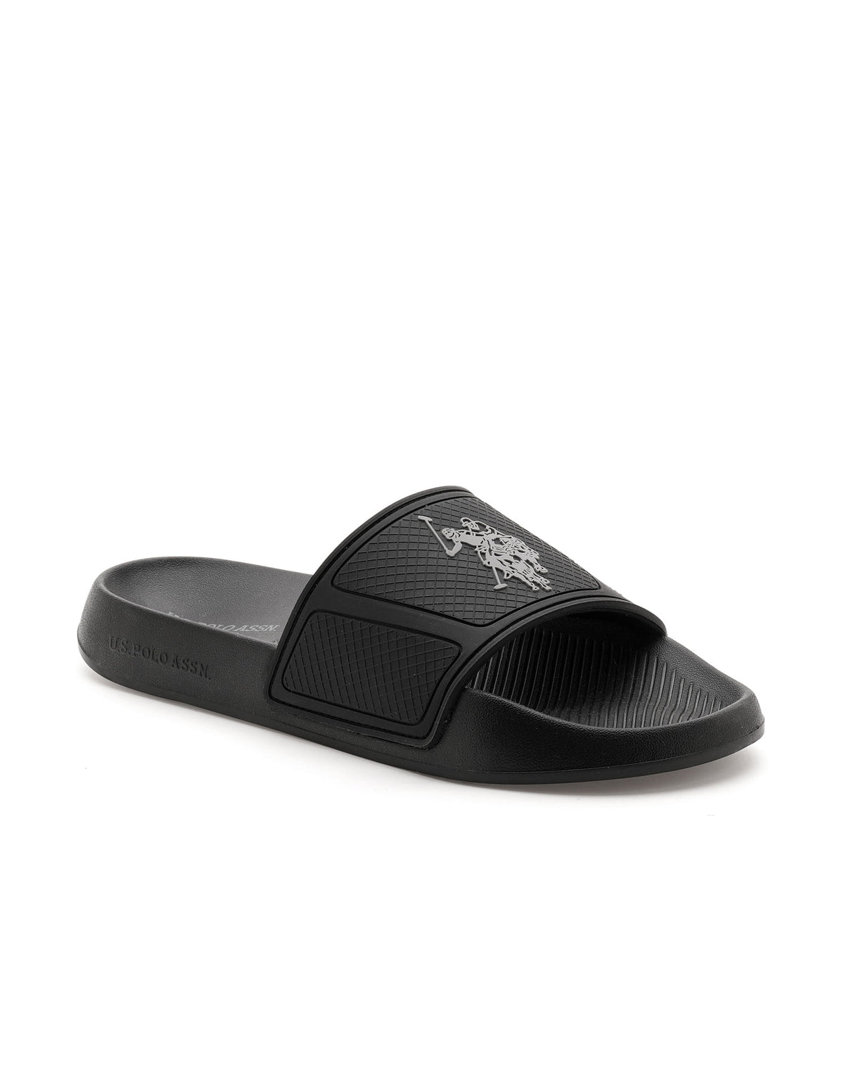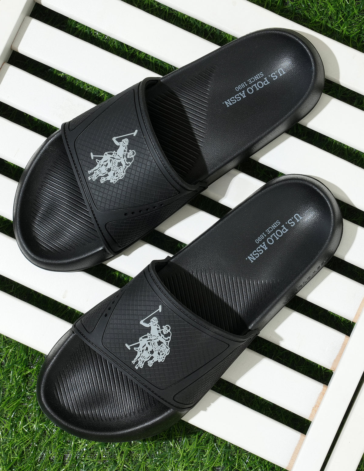 | Open toe | Logo at vamp strap | Cushioned insole with logo | Textured outsole | Brand printed pattern |