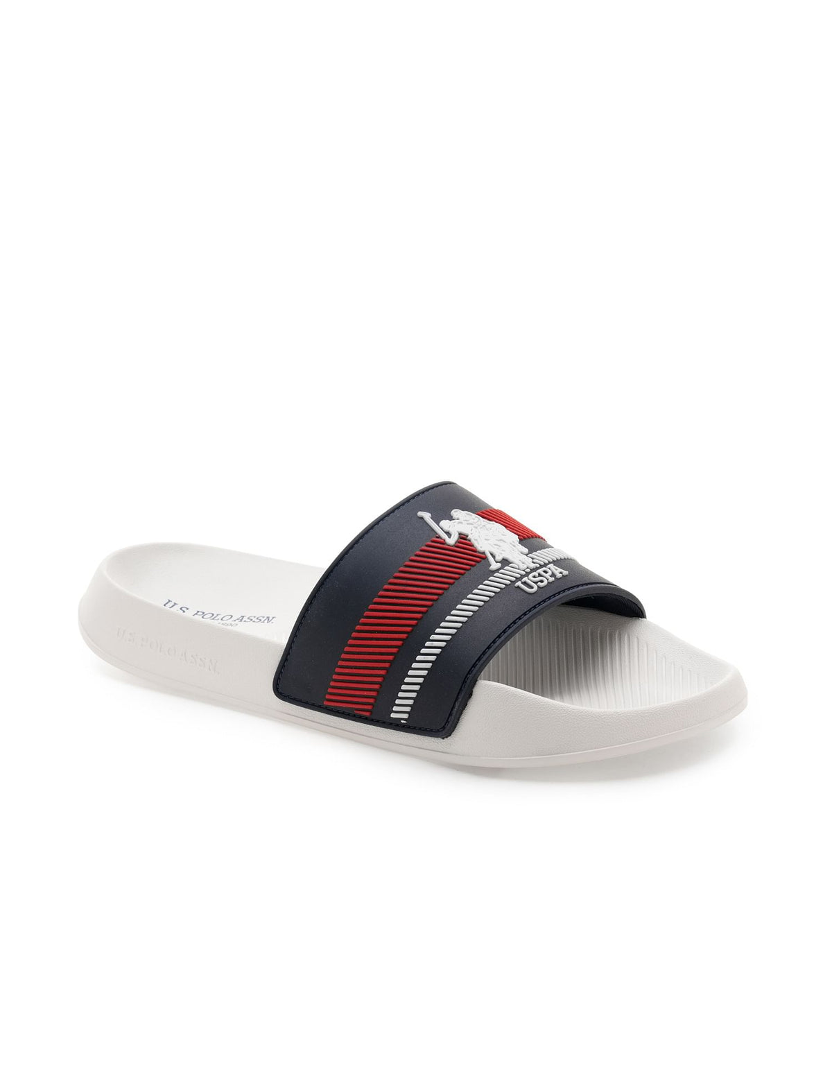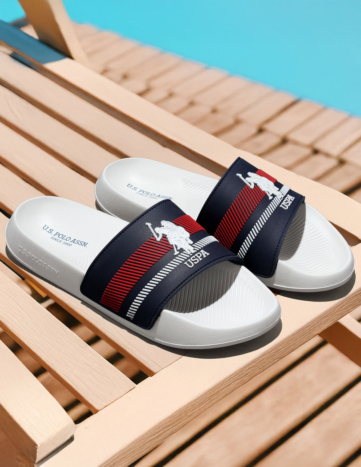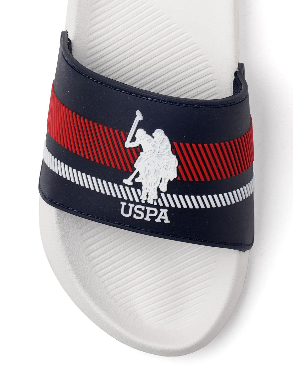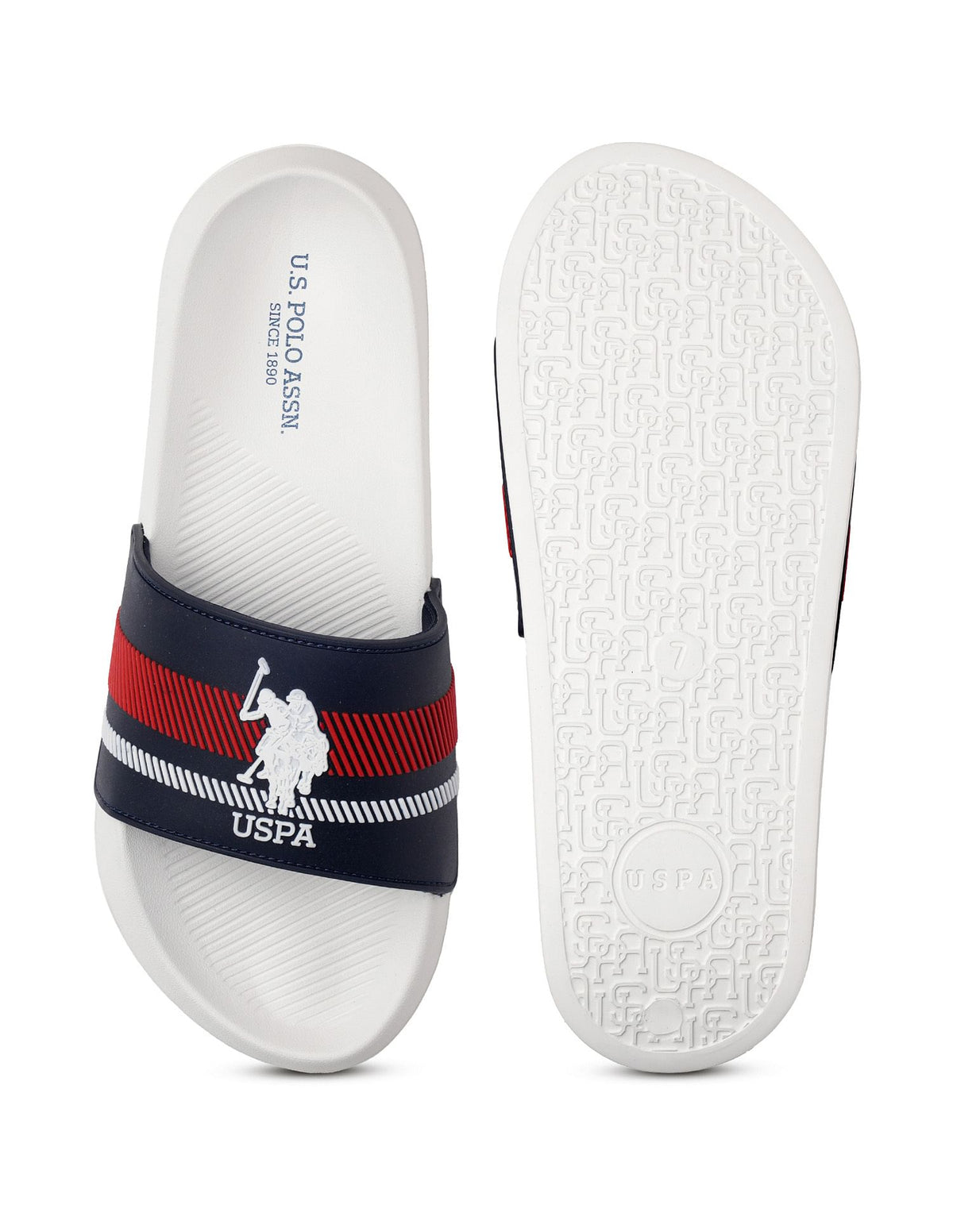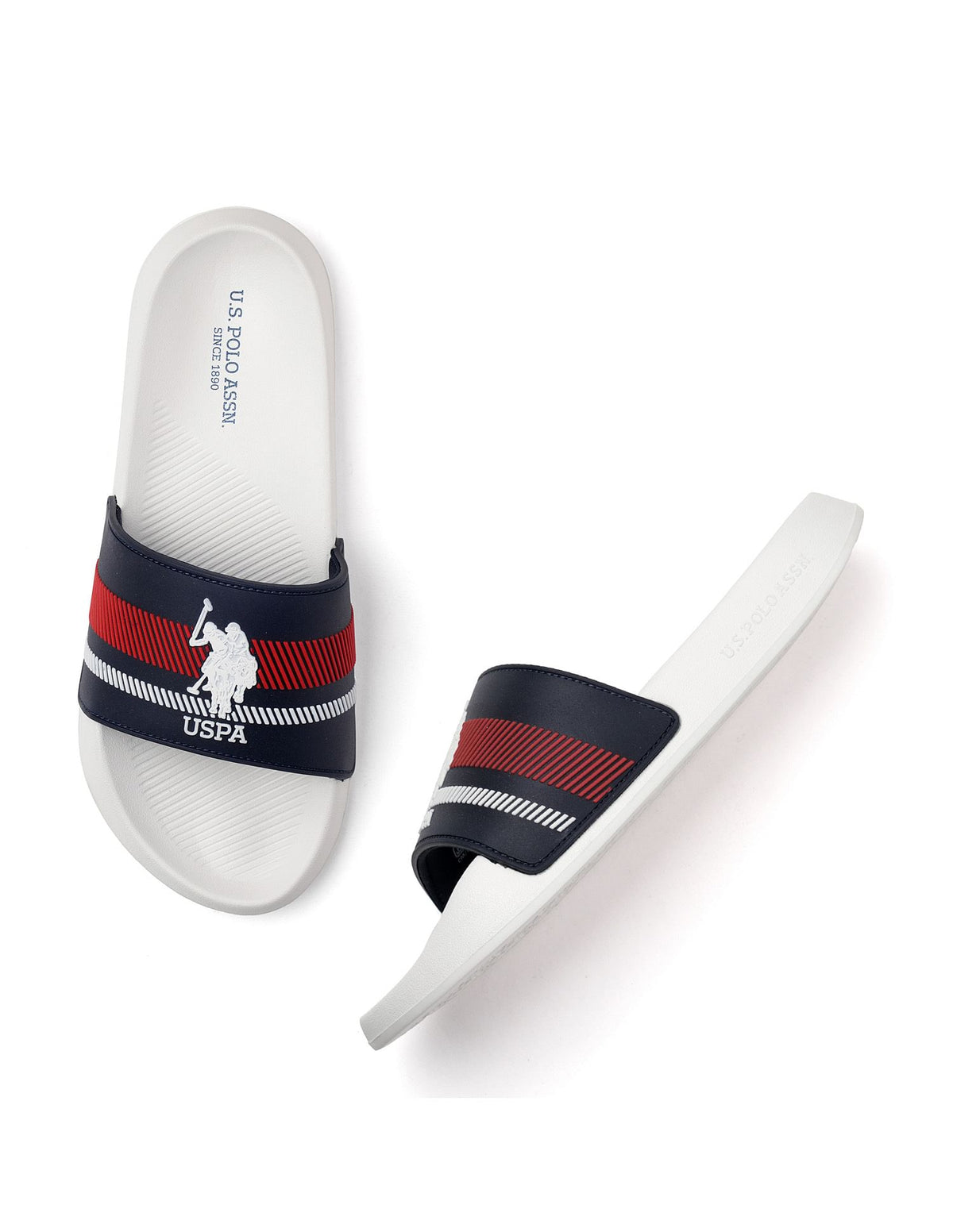 | Open toe | Logo at vamp strap | Cushioned insole with logo | Textured outsole | Brand printed pattern |